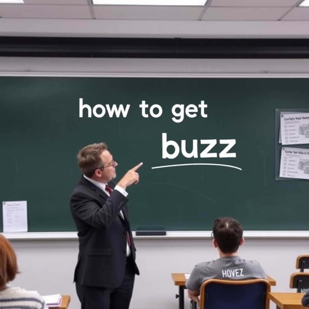 Teacher , Pointing to the board , classroom , text on board "how to get buzz 1. For each unique reaction you give 2buzz 2. By claiming it daily in the Image generator 25buzz 3. For the first image post you make each day 25buzz 4. For each user that reacts to anything you created in the last 30 days 2buzz 5. For first 3 people that you follow each day 10buzz 6. And you have more way to get it"