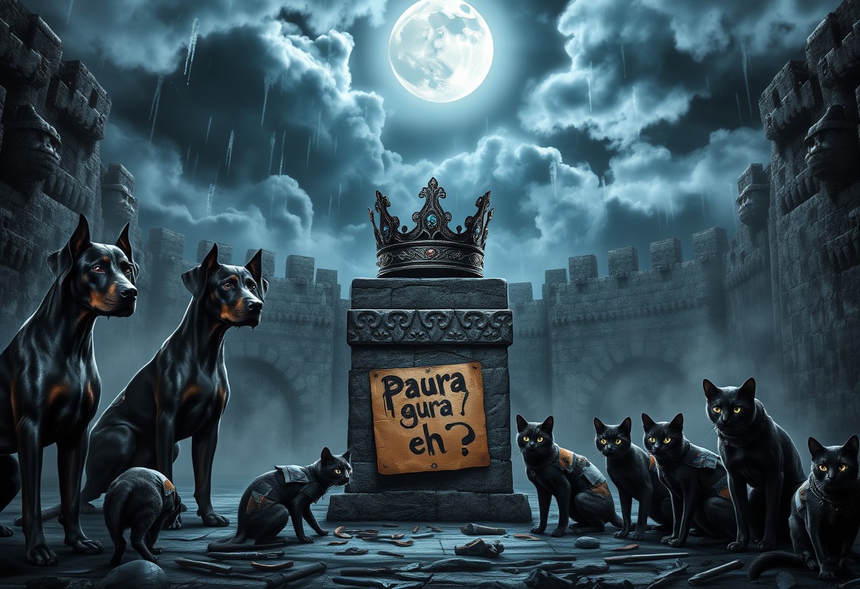Under a stormy sky, a medieval arena carved from ancient stone is illuminated by cold, silvery moonlight. The scene is tense, with five Dobermans standing on one side, their muscular forms clad in dark, battle-worn armor engraved with intricate patterns. Their eyes glow with an unnatural intensity, and their breath forms mist in the chilly night air. Opposite them, five enigmatic cats crouch low, each wearing patchwork armor made from scavenged materials—leather, metal, and bones. Their reflective eyes glint in the darkness as their tails flick in anticipation. At the center of the arena, a stone pedestal holds a crown made of twisted metal and dark, glimmering jewels, emitting an eerie, pulsating glow. The ground around the pedestal is littered with remnants of past battles—broken weapons and shattered armor. A weathered cardboard sign, hanging from the pedestal, reads “Paura eh?” in jagged, dripping script, as if taunting both sides. The atmosphere is charged with suspense as the Dobermans and cats, driven by a mixture of fear and determination, prepare for the imminent clash under the watchful, ominous moon.
