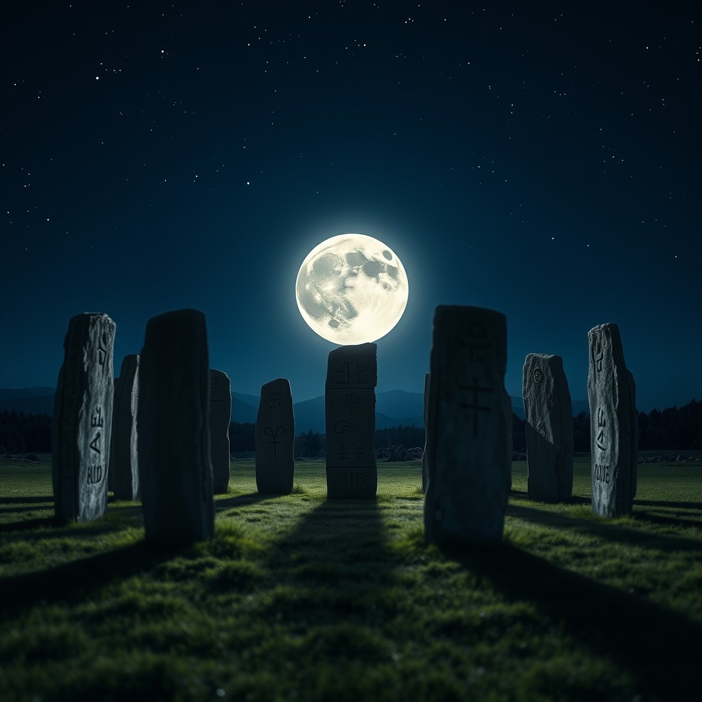high quality, 8K Ultra HD. depth of field, long shot. night time scene with a full moon illuminating an irregular circle of ancient standing stones. The layout is centered on the moon, which is framed by the tall, weathered stones. The stones are engraved with various symbols and markings, and they cast long shadows on the grassy ground. The sky is dark with scattered stars, and the horizon shows a silhouette of distant forests and mountains. The overall atmosphere is gothic , with the moonlight providing menacing atmosphere to the scene.