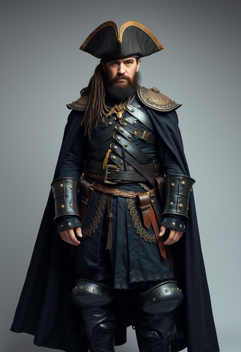 a pirate captain, full shot, handsome, heroic, epic, iron and leather armour, dark clothes, oriental damask ornaments, long cape, in the style of restrained palette, distressed materials, realistic color schemes, hieratic visionary, figura serpentinata, nicola samori, bold yet graceful , pirate boots, alexander McQueen fashion costume style, light grey background studio