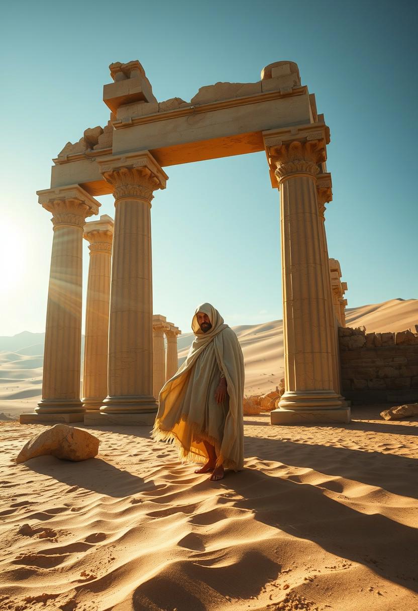Masterpiece, high res, best quality, Ruins of ancient temple in the desert, one man, wrapped in a cloak, stands next to a column and looks at the viewer. His eyes shine with white light, and the hems of his cloak turn into sand, renewed by the wind. Sand ghost. It's sunny, soft colors, high detalize, mysterios