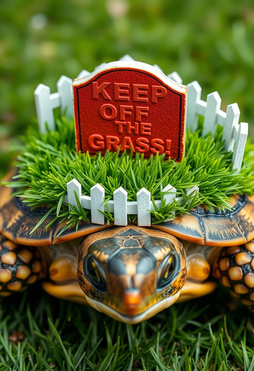 Create a hyper-realistic, hyper-detailed depiction of a turtle with a perfectly manicured lawn on its shell, complete with a white picket fence and a sign that reads "Keep Off The Grass!" in bold, red letters. The lawn is a vibrant, emerald green, with delicate blades of grass that seem to sway in the breeze. The turtle's shell is a weathered, brown color, with subtle texture and cracks that seem to add to the illusion of a miniature suburban landscape. Style: hyper-realistic, detailed, whimsical. Colors: green, brown, white, red. Highest-Quality, 4k, Masterpiece