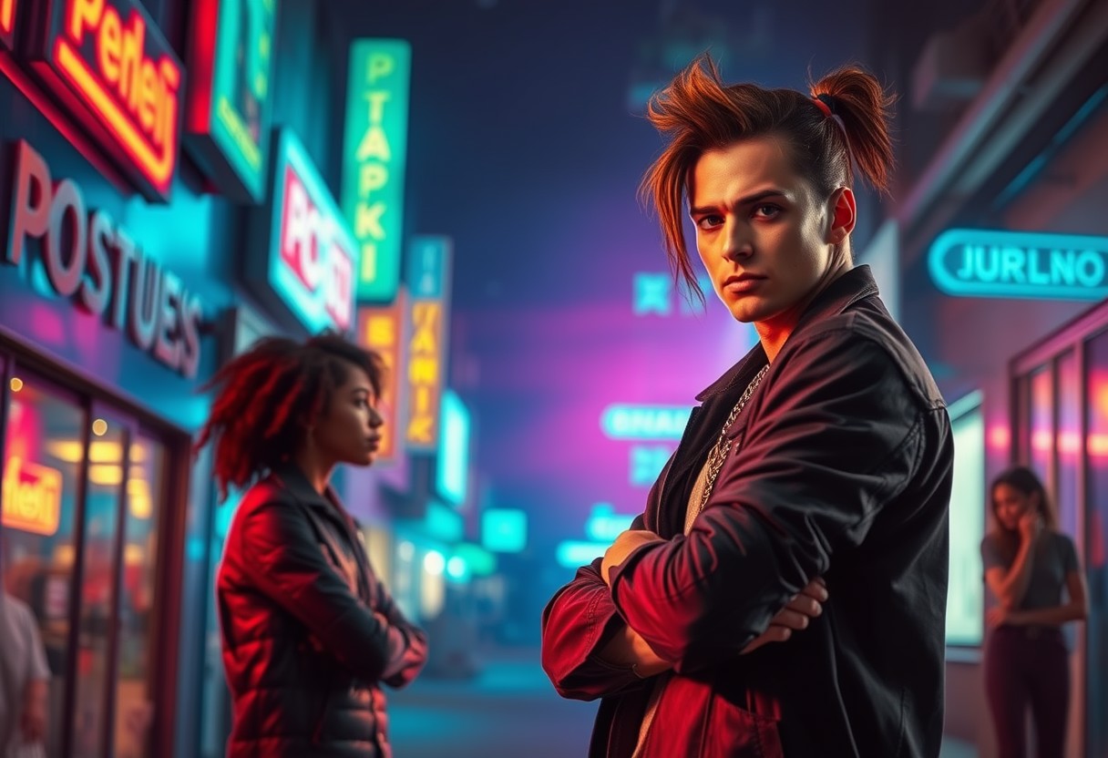 Create an image that captures the intensity and tension of a confrontational moment. Picture a dynamic scene with two characters facing off, set in a modern, urban environment. The background is filled with neon lights, casting a colorful yet moody glow on the characters. The main character, dressed in edgy, street-style clothing, is standing confidently with a determined expression, while the other character, slightly in the background, looks caught off guard. The energy is electric, with a sense of movement as if the scene is frozen mid-action. The overall color palette should be vibrant with strong contrasts, emphasizing the emotions of the confrontation.