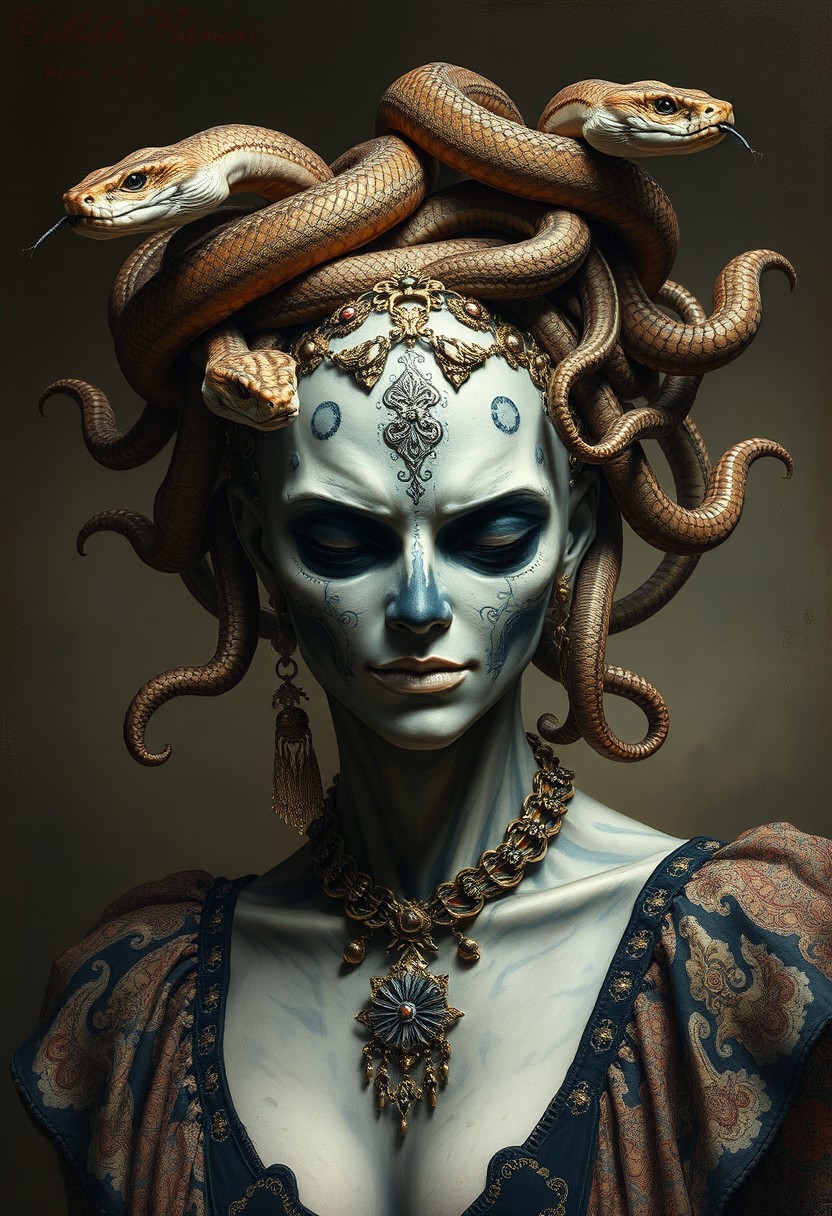 Medusa, snakes at the head, oriental damask ornaments, in the style of restrained palette, distressed materials, realistic color schemes, hieratic visionary, figura serpentinata, nicola samori, bold yet graceful , alexander McQueen fashion costume style, oil painting style