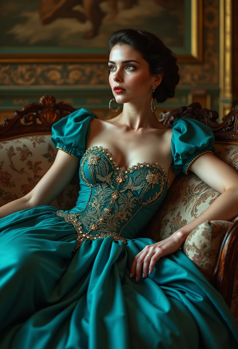 A hyperrealistic portrait of a regal woman with an imperious air. She is attired in an ornate teal gown with a bodice reminiscent of both Victorian and fantastical aesthetics. Her posture is one of languid confidence as she reclines on a chaise longue. Utilize chiaroscuro lighting to highlight the intricate embroidery and metallic accents on her dress and the aristocratic features of her face. The background should be evocative of opulent palace interiors, featuring gilded moldings and rich tapestries. The overall composition should exude an air of power and sophistication, with a hint of wistfulness in the subjectâs gaze. Hyperrealistic photo, anamorphic lensing, tessellated chiaroscuro, high dynamic range, film grain, 1.8 gamma curve.
