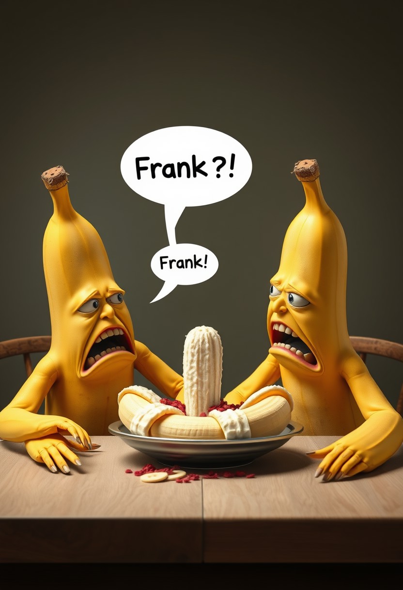 Create a hyper-realistic, hyper-detailed image of two bananas sitting at a table, their faces contorted in horror as they gaze at a banana split in the center. One banana says "Frank?!" in a speech bubble. The bananas are rendered in exquisite detail, with subtle texture and shading that conveys their emotional distress. Style: hyper-realistic, comedic, surreal. Colors: yellow, creamy white, and a hint of green. Highest-Quality, 4k, Masterpiece