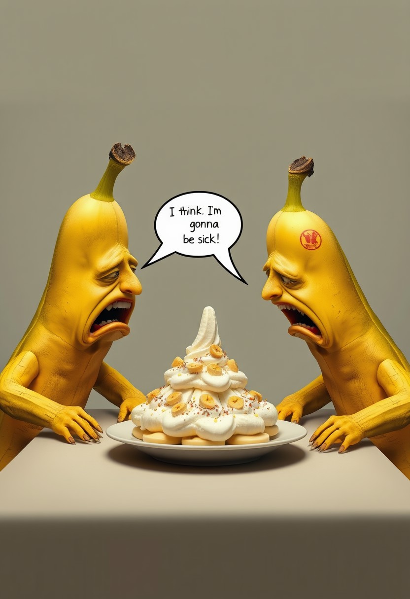 Create a hyper-realistic, hyper-detailed image of two bananas sitting at a table, their faces contorted in horror as they gaze at a banana split in the center. One banana says "I think I'm gonna be sick!" in a speech bubble, while the other says "Frank?! Speak to me!". The bananas are rendered in exquisite detail, with subtle texture and shading that conveys their emotional distress. Style: hyper-realistic, comedic, surreal. Colors: yellow, creamy white, and a hint of green. Highest-Quality, 4k, Masterpiece