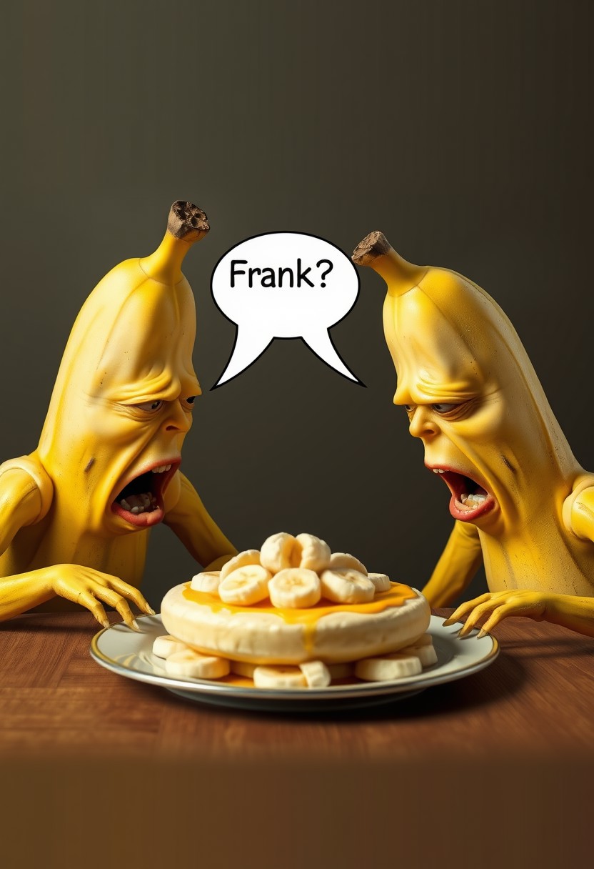 Create a hyper-realistic, hyper-detailed image of two bananas sitting at a table, their faces contorted in horror as they gaze at a banana split in the center. One banana says "Frank?!" in a speech bubble. The bananas are rendered in exquisite detail, with subtle texture and shading that conveys their emotional distress. Style: hyper-realistic, comedic, surreal. Colors: yellow, creamy white, and a hint of green. Highest-Quality, 4k, Masterpiece