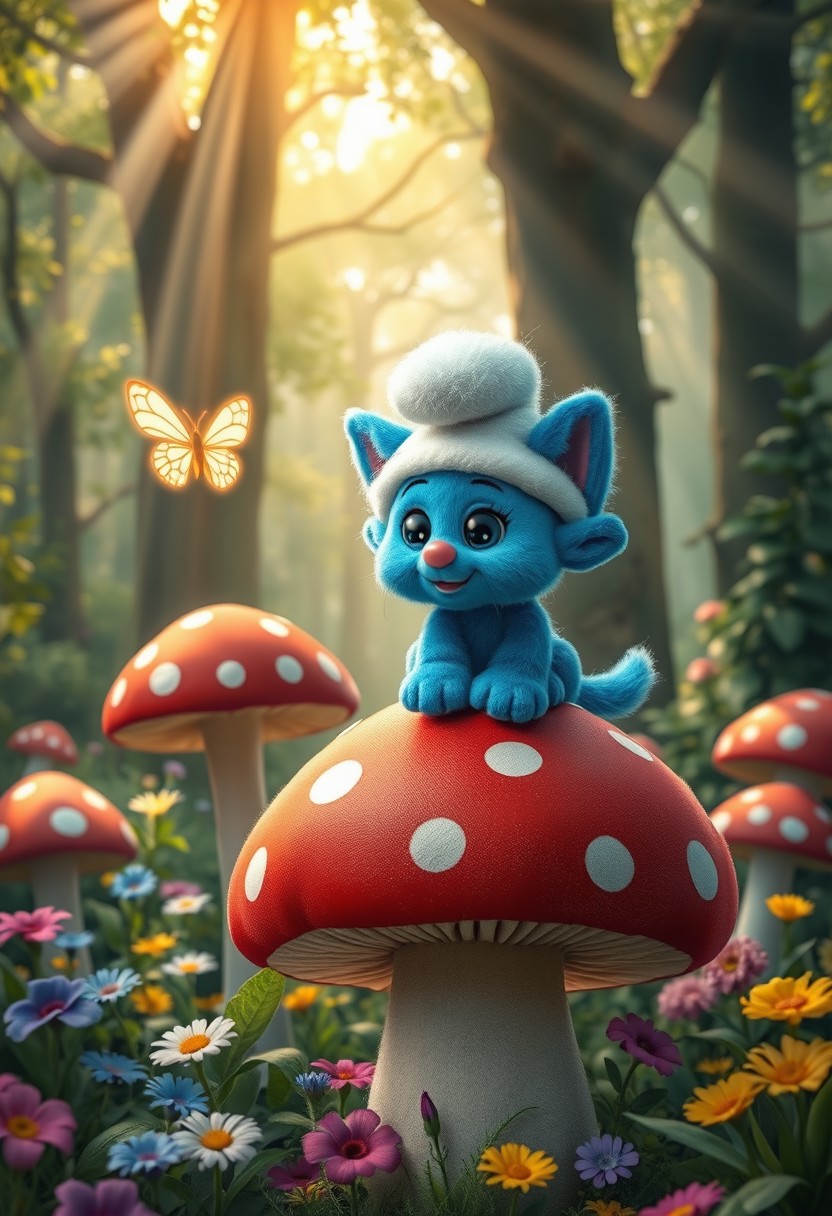 Smurfcat, Create a whimsical and charming scene featuring Smurfcat, a small, blue feline with a friendly and curious expression. Smurfcat's fur is a vivid, bright blue, with a soft, plush texture that adds to its endearing appearance. It has large, expressive eyes that glisten with curiosity and mischief, and a small, pink nose. Smurfcat is wearing a white mushroom hat that sits slightly askew on its head, adding a playful touch to its look. The scene is set in an enchanting, forested area filled with oversized mushrooms, vibrant flowers, and lush greenery. Smurfcat is perched on top of a large, red-and-white spotted mushroom, playfully batting at a glowing, floating butterfly. The background is filled with towering trees, their leaves forming a canopy that allows beams of sunlight to filter through, casting a warm, golden glow over the scene. The overall atmosphere is magical and lighthearted, capturing the fun and adventurous spirit of Smurfcat in its whimsical world.