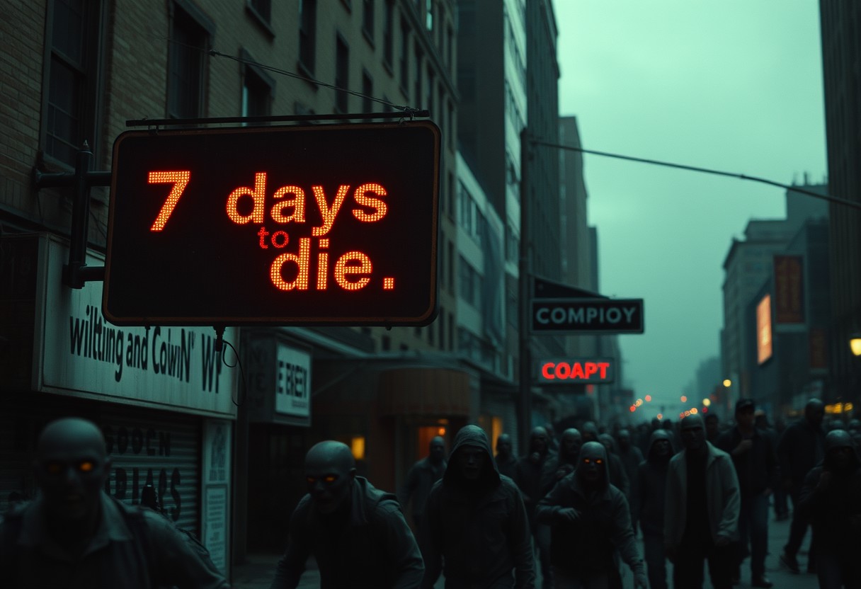 photo , Film Still, Cinematic ,Blanco Brown - city sign reads '7 days to die' , Zombies hoard attack suriviors, urban decay, glowing eyes, in every shadow death does embark