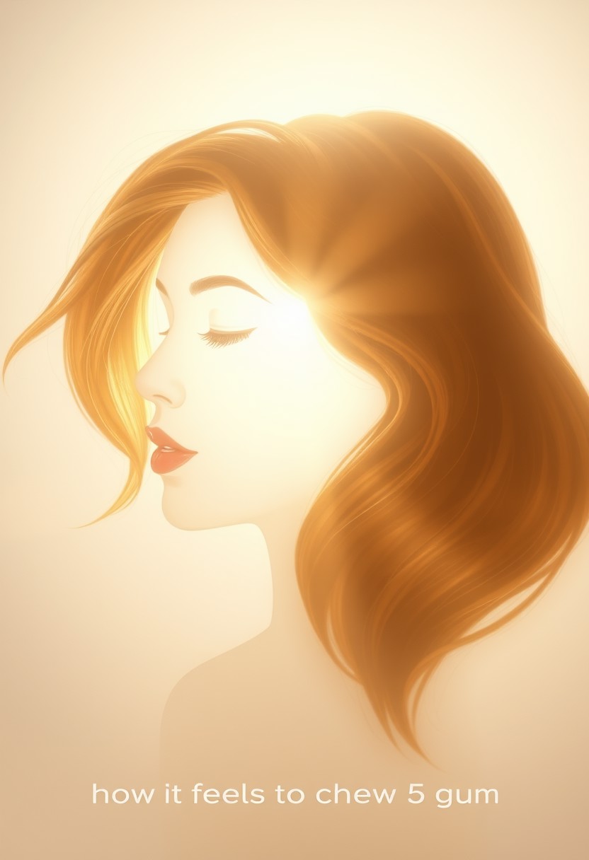 Beauty, realism, chiaroscuro, rays of light, play of shadow and light, cinematic style, Super HD, Pastel, chalk, crayon drawing, surreal and elegant image of a pack of chewing gum forming a detailed and graceful silhouette of a woman's face. The woman's flowing hair smoothly transitions into gold tones highlighting the strands. The background is a soft, light color that enhances the contrast and elegance of the pack of chewing gum and steam. The overall atmosphere is sophisticated, dreamy and artistic.the caption is "how it feels to chew 5 gum"