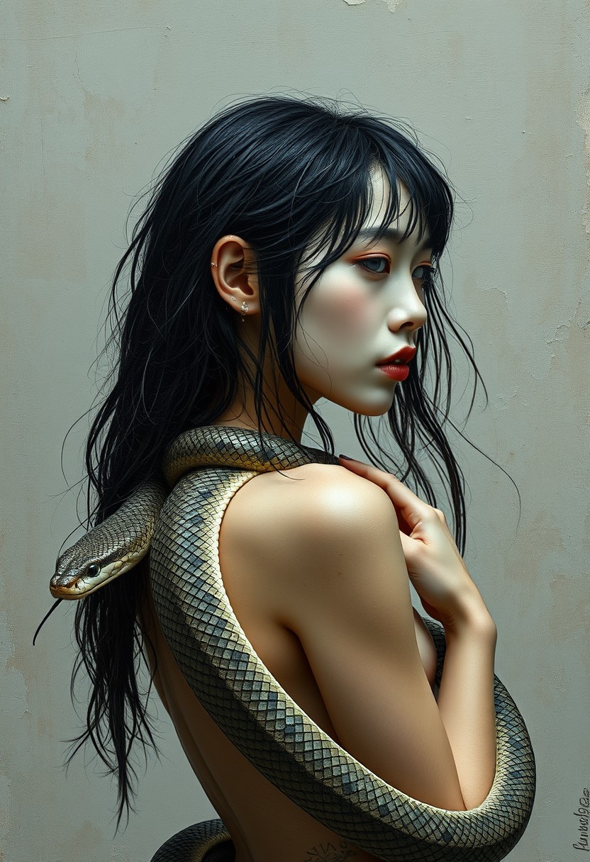 medium shot, side view, Beautiful girl, wet snake, japanese, white pale skin, partial nudity, oriental damask ornaments, in the style of restrained palette, distressed materials, realistic color schemes, hieratic visionary, figura serpentinata, nicola samori, bold yet graceful , alexander McQueen fashion costume style, oil painting style