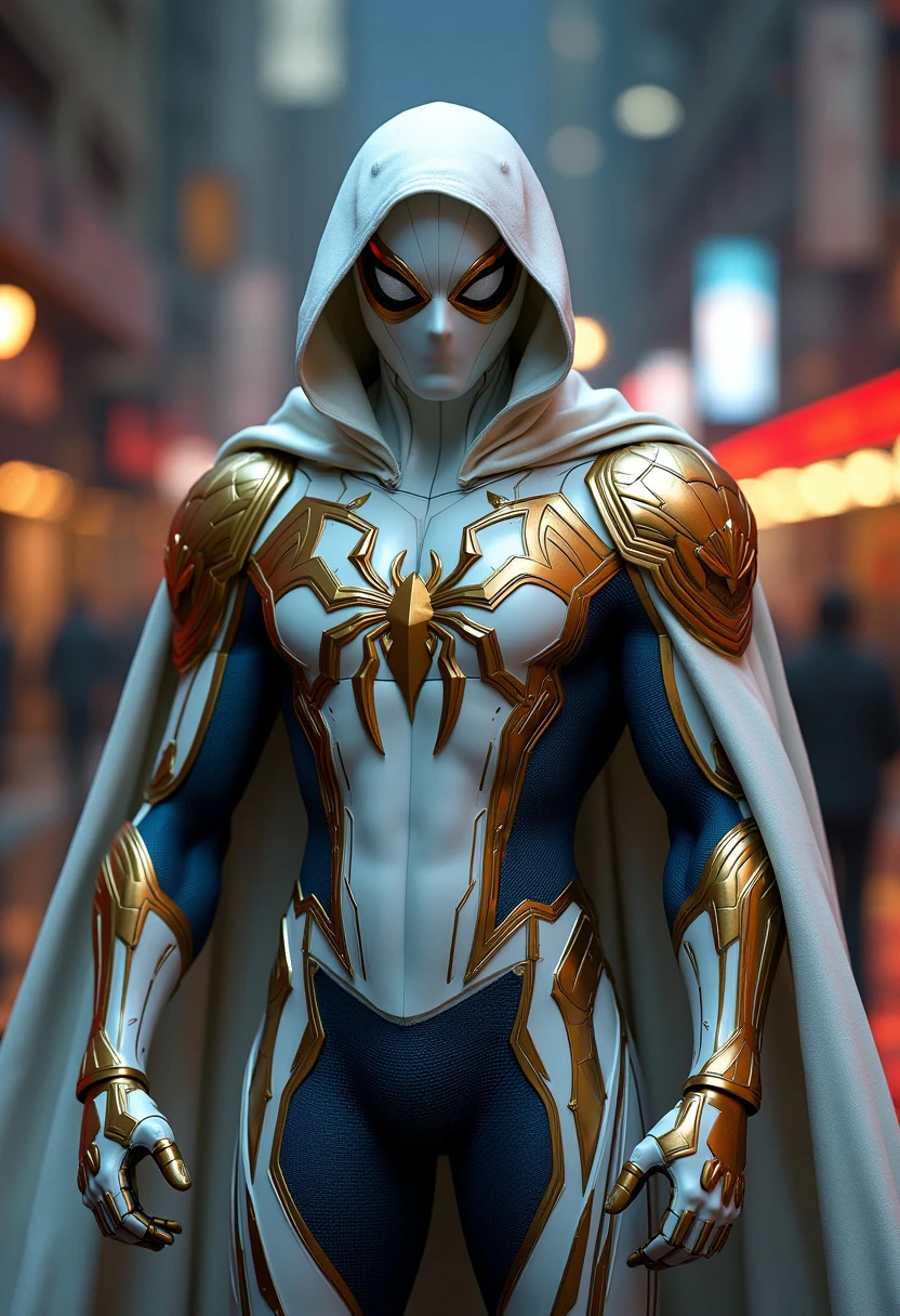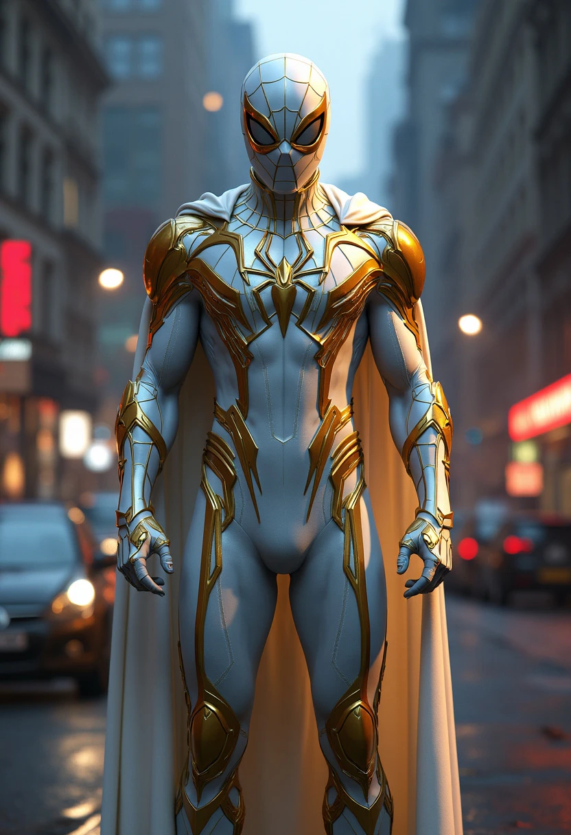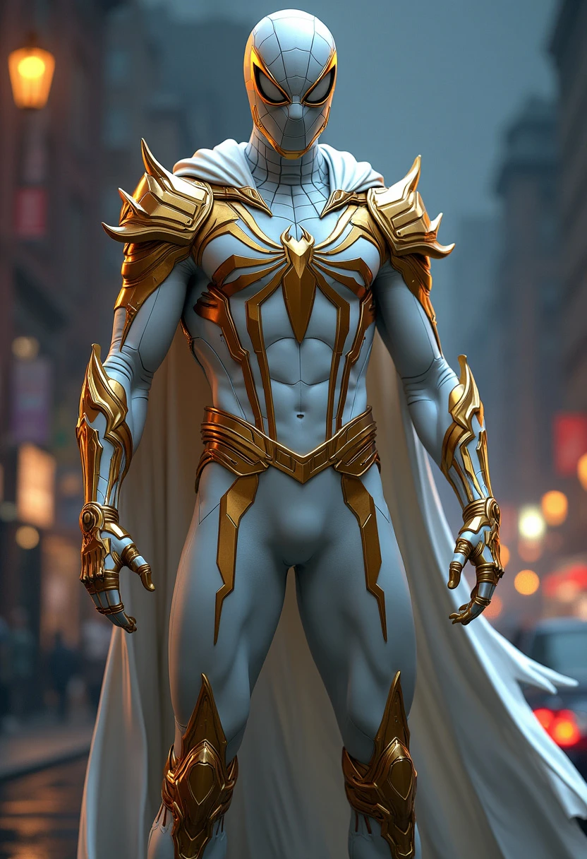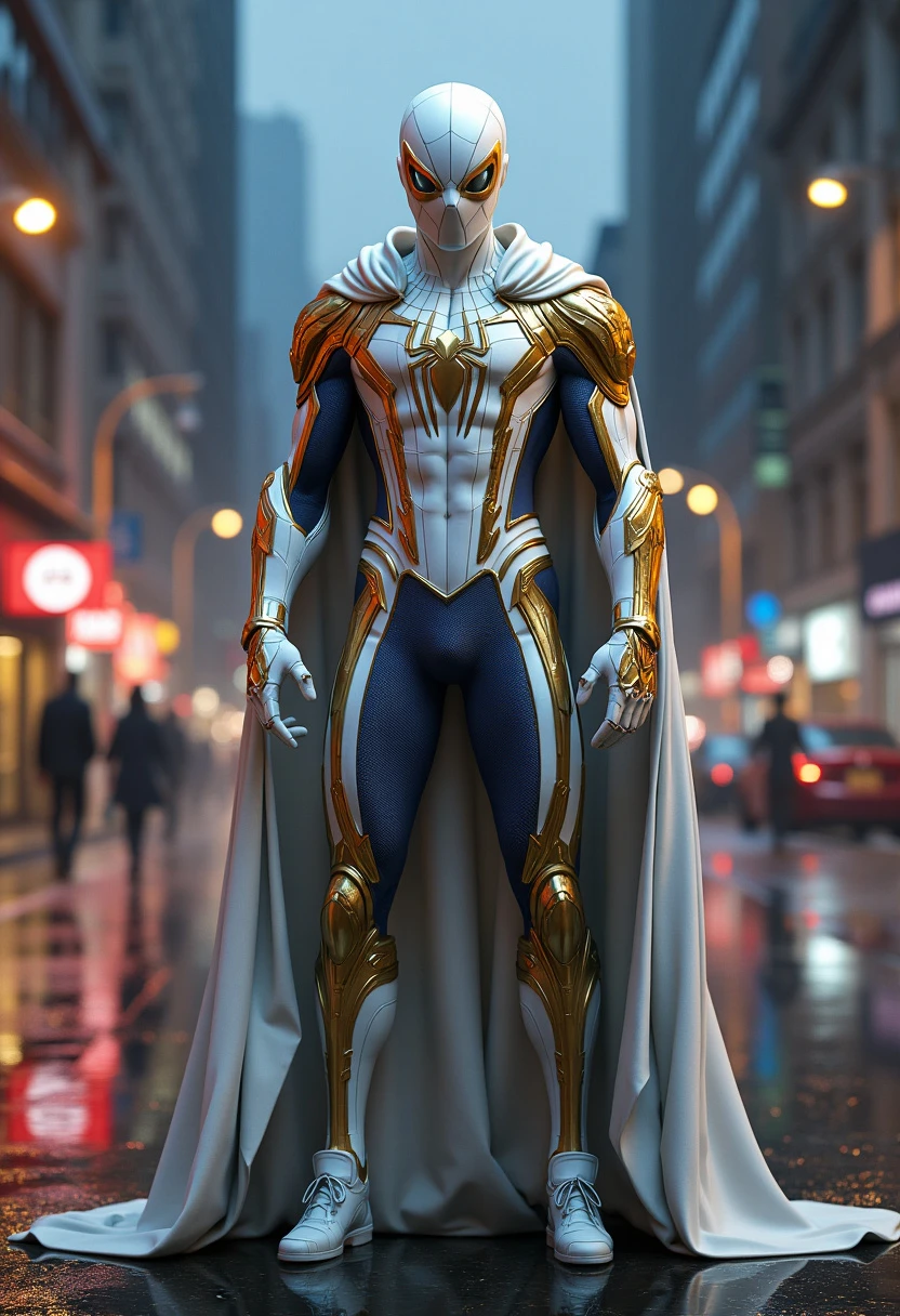 Full body shot of Spider-Man in white and gold armor style suit, no mask on, white cape, looking at center camera, perfect composition, beautiful detailed intricate insanely detailed octane render trending on ArtStation, 8k artistic photography, photorealistic concept art, soft natural volumetric cinematic perfect light, chiaroscuro, award-winning photograph, masterpiece, oil on canvas, Raphael, Caravaggio, Greg Rutkowski, beetle, beksinski, giger, trending on ArtStation, sharp focus, studio photo, intricate details, highly detailed, night city background,