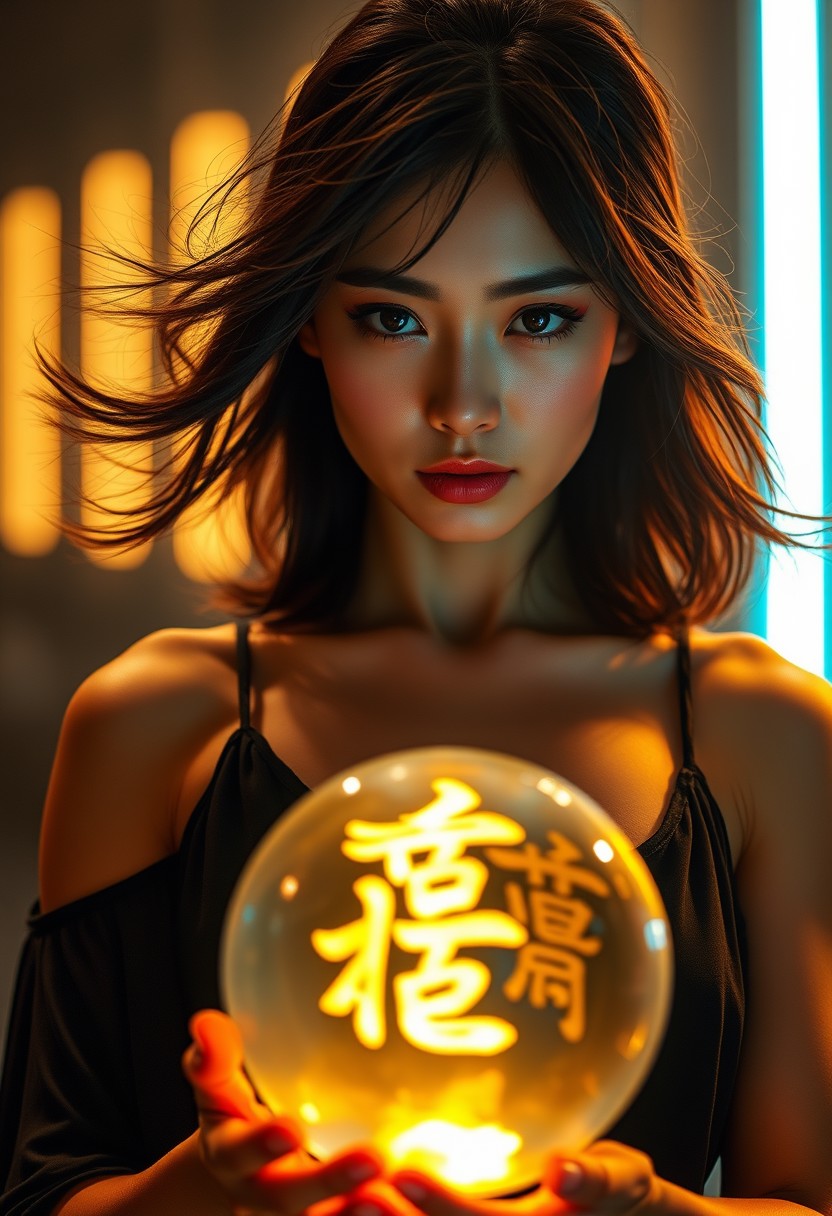 A young, athletic, 6 foot, half-japanes woman. She has medium-length dark hair that flows freely as she moves, and her expression is focused and determined. She wears a black sleeveless loose top that shows cleavage, her large chesty and muscular arms. She holds a crystal ball in front of her and gazes into it. The crystal ball glows woth golden and cyan energies swirling in it forming Kanji Script. Close up, 50mm lens, Canon, rim lights, strip lights, soft shadows, golden ligh from right, neon cyan light from left
