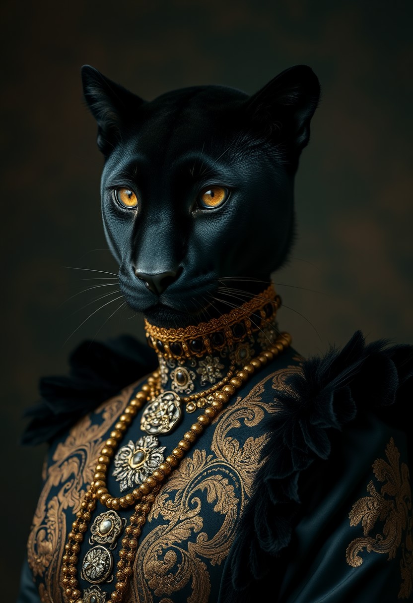 medium shot, elegant and majestic portrait of a Hybrid between a female black panther and a black african woman, panther head, woman body, victorian costume, ornamented, damask fabric, black and gold, hyper-realistic, studio photography, perfect textures, vintage photography