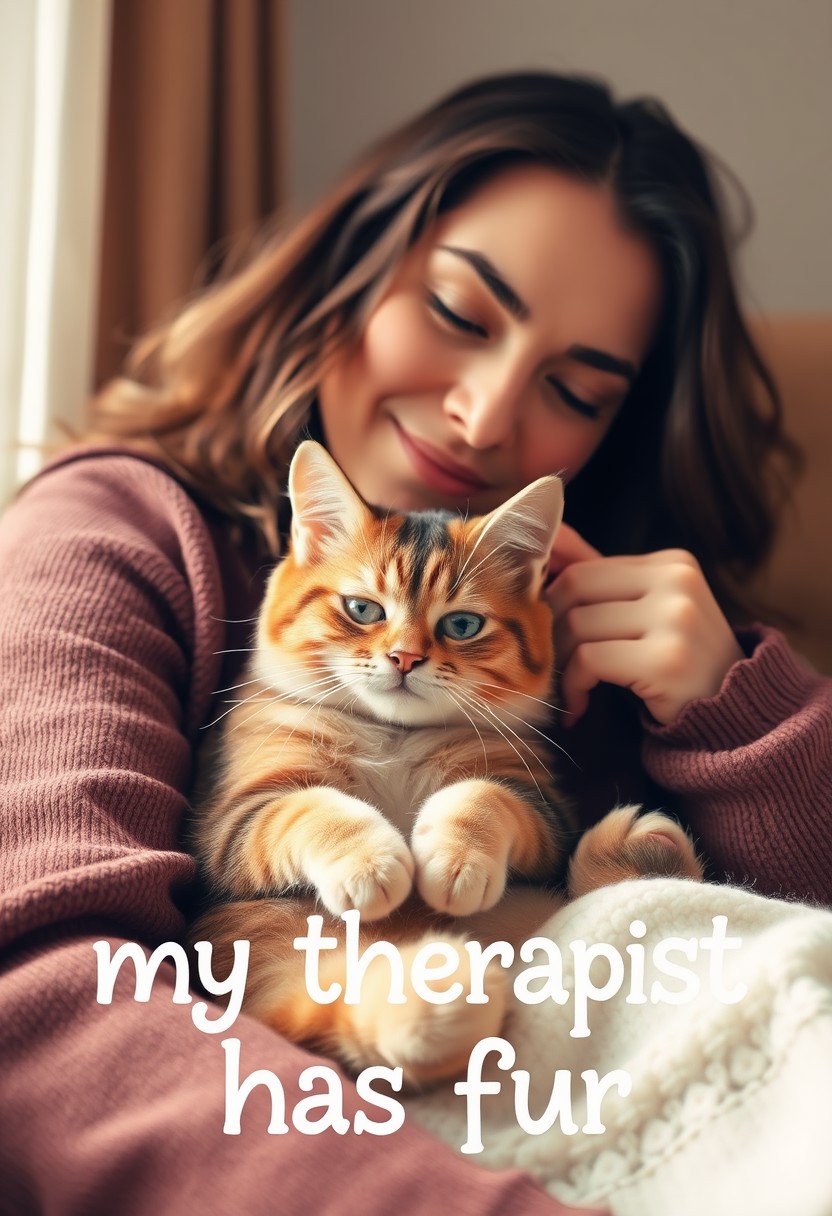 A warm and cozy moment captured on camera, with a plush cat nestled snugly in a woman's lap. The cat's soft fur blends seamlessly with her gentle touch as she strokes its whiskered face. Natural light pours in from the left, highlighting the tender scene. The woman's relaxed expression radiates calmness, while the cat's contented gaze conveys trust and companionship. The whimsical font below reads: 'my therapist has fur', a playful nod to the therapeutic bond shared between human and feline.