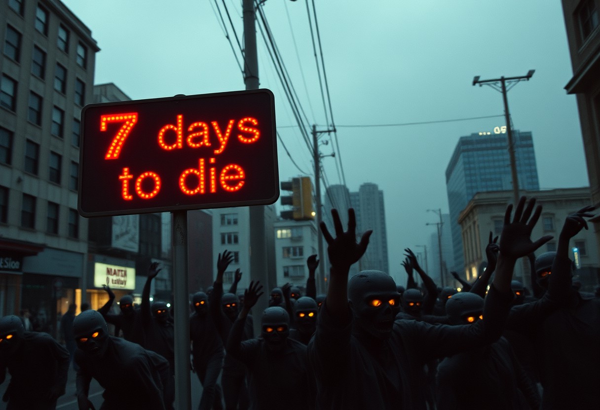 photo , Film Still, Cinematic ,Blanco Brown - city sign reads '7 days to die' , Zombies hoard attack suriviors, urban decay, glowing eyes, in every shadow death does embark