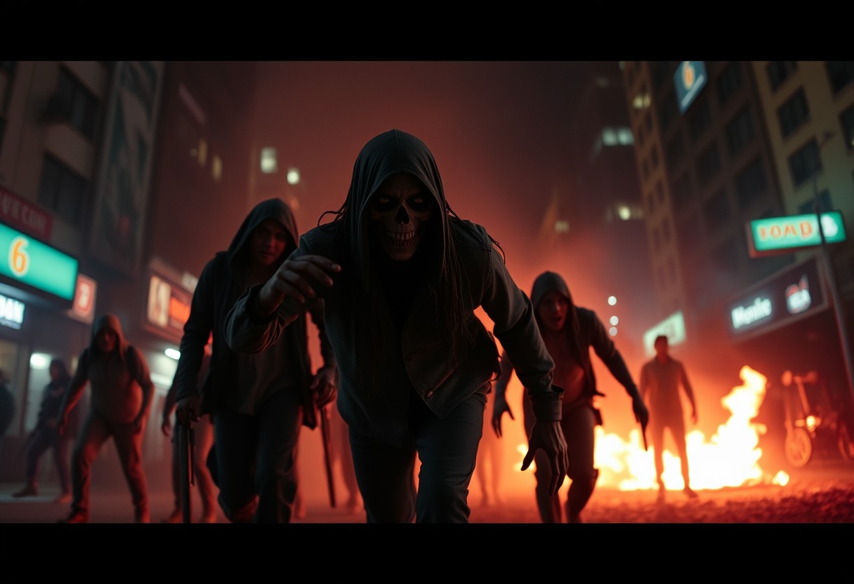 photo , Film Still, Cinematic ,Blanco Brown - 7 days to die, Zombies hoard attack suriviors, urban decay, glowing eyes, in every shadow death does embark