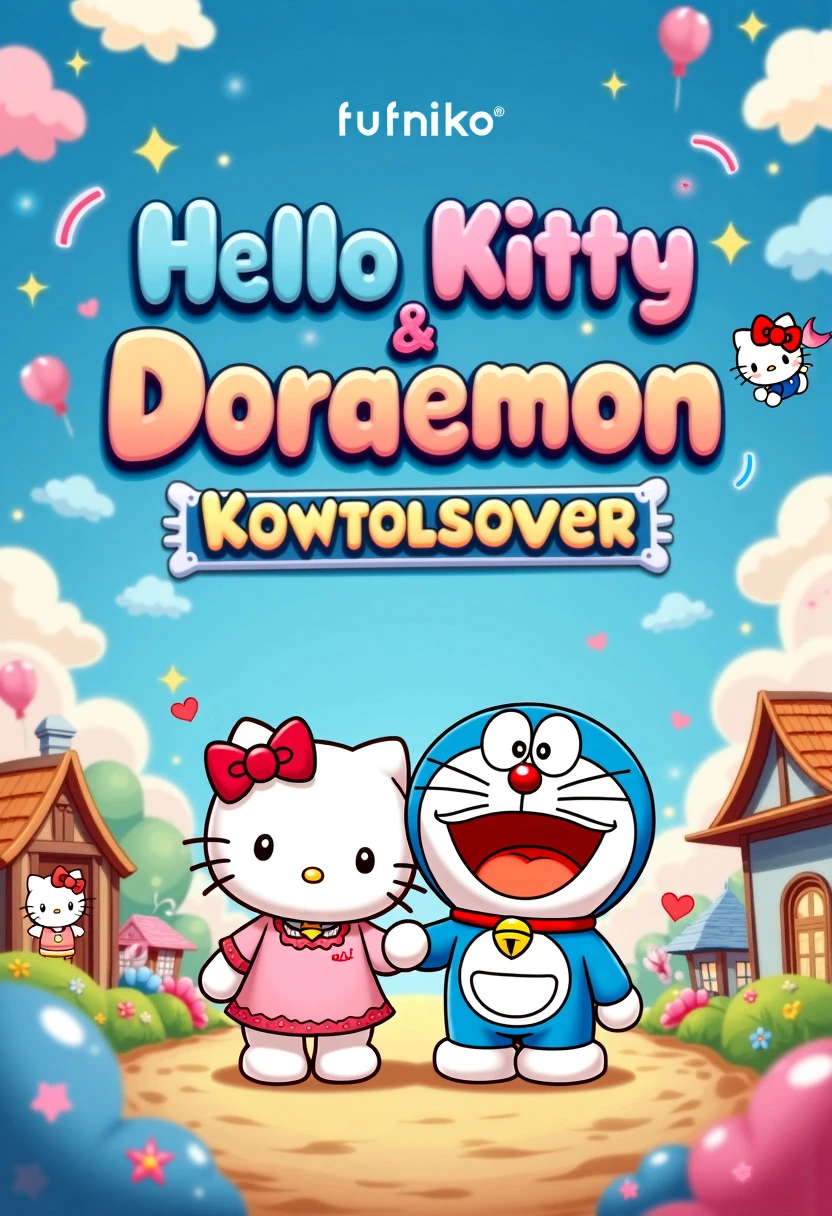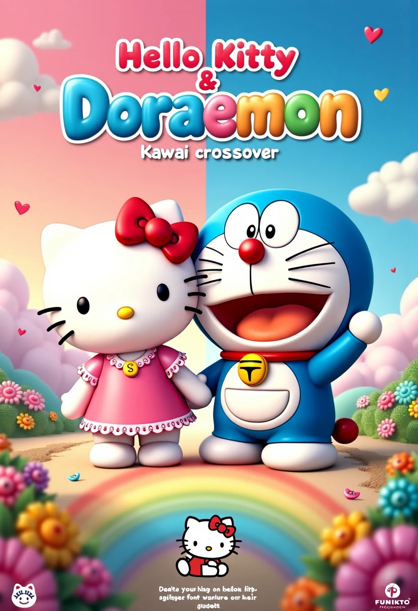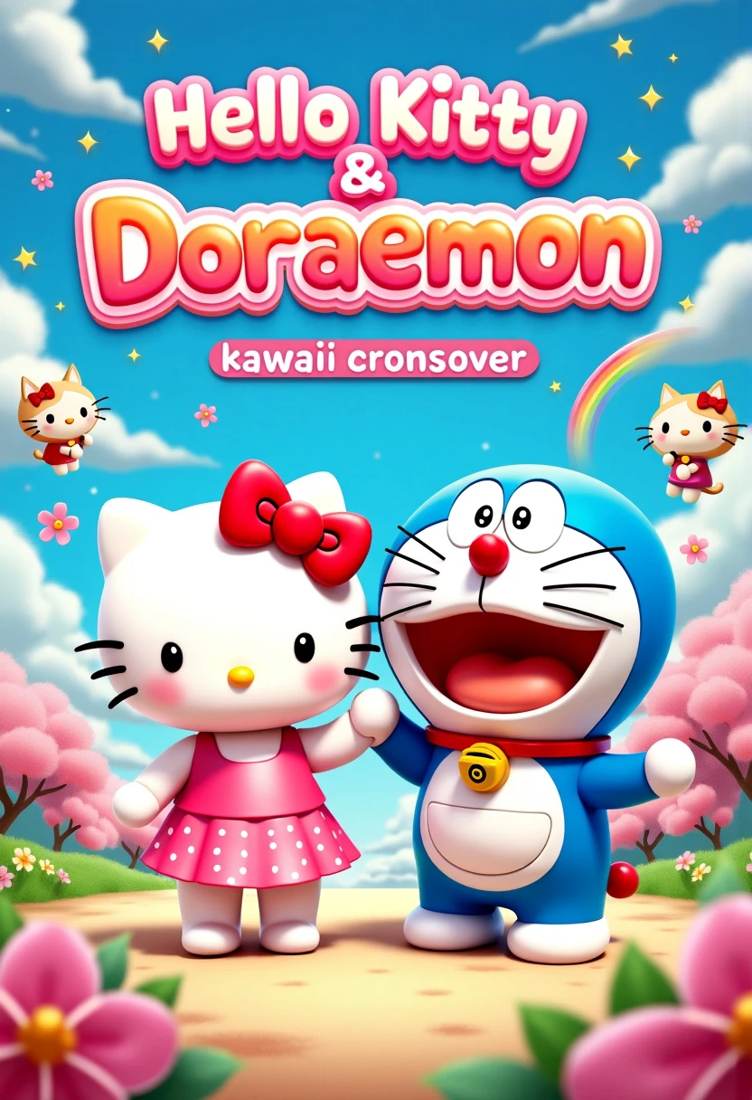Movie poster for "Hello Kitty & Doraemon: Kawaii Crossover". Title Font: - Playful, round, and bubbly font combining Hello Kitty's cuteness and Doraemon's futuristic touch. - Letters slightly inflated with glossy, candy-like appearance. - Color gradient from pastel pink to sky blue with white outlines. Visual Elements: 1. Central Focus: Hello Kitty and Doraemon standing side by side, hands/paws joined in friendship. Hello Kitty on the left, Doraemon on the right. 2. Background: Dreamy, pastel-colored landscape blending Hello Kitty's world with Doraemon's: - Left half: Hello Kitty's home with flowers and rainbows. - Right half: Futuristic elements from Doraemon's world. 3. Gadgets: Various Doraemon gadgets floating around, including: - Anywhere Door - Take-copter - Time Machine 4. Hello Kitty's Friends: Dear Daniel, My Melody, and Keroppi peeking out from behind colorful clouds or flowers. 5. Nobita and Friends: Chibi versions of Nobita, Shizuka, Gian, and Suneo interacting with Hello Kitty's world in the background. 6. Magic Pocket: Doraemon's iconic 4D Pocket prominently displayed, with cute items and Hello Kitty-themed gadgets spilling out. 7. Bow Motif: Hello Kitty's signature red bow incorporated into various elements, including a bowtie on Doraemon. 8. Dorayaki: Pile of dorayaki arranged in a heart shape near the characters. 9. Time Portals: Swirling time portals in corners, suggesting adventures across different eras. 10. Sparkles and Stars: Cute sparkles and stars scattered throughout, adding magical and whimsical touch. 11. Brand Logos: Small, subtle logos of Sanrio and Fujiko Pro in bottom corners. This poster concept blends the kawaii aesthetics of Hello Kitty with the playful, futuristic elements of Doraemon, creating a vibrant and appealing crossover that fans of both franchises will enjoy.