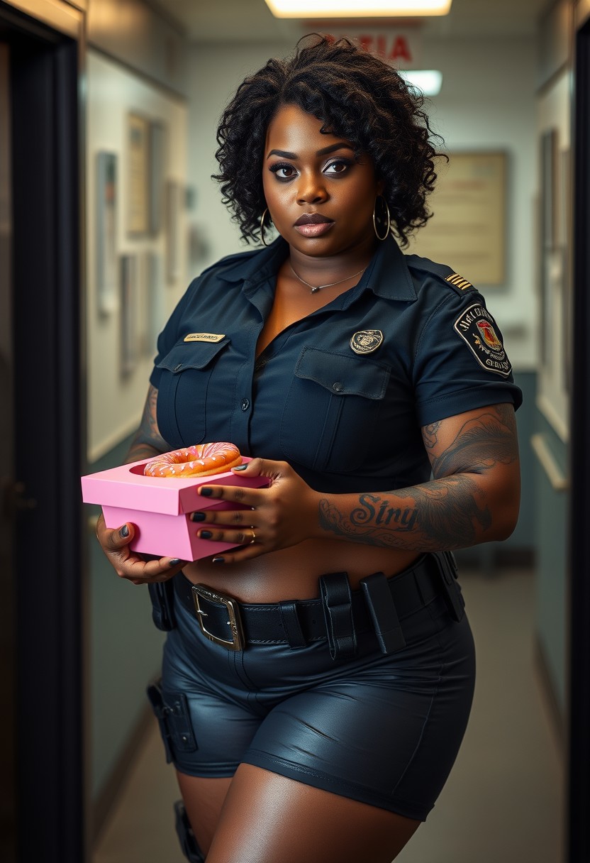 Highest quality, (cinematic lighting:1.1), action movie film still, (a thick black lesbian woman police officer with short curly hair), perfect face, detailed facial features, alluring eyes, (wearing naughty police uniform with short skirt and harness), seductively posing inside a police department, chubby body, tummy, large breasts, big ass, [wide hips], (highly detailed skin), punk tattoos, ambient light, photographed on a Nikon Z9, RF 35mm lens, F2.8, HDR, 8k, highly detailed, Cinestill 800T, dynamic angle, (full body:0.9), holding a pink box of donuts with a sheepish look on her face.