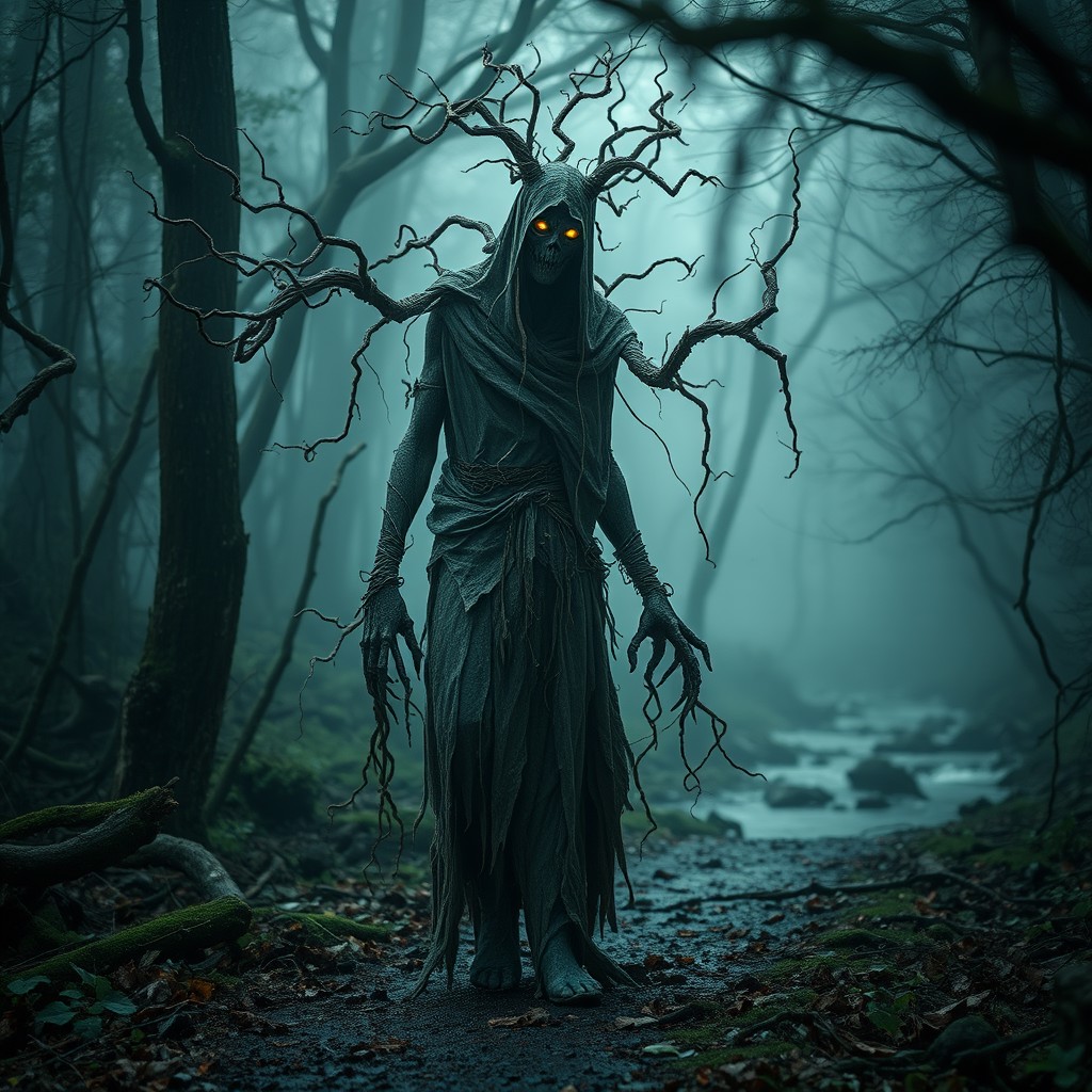 high focus angle, cursed Forest Guardian, Ghostly figure, tattered garments, glowing eyes, twisted branches and vines growing from body, silently patrolling forest path, ultra realistic, hyper detailed, hdr, 4k, dark river, misty ambiance, mistycal