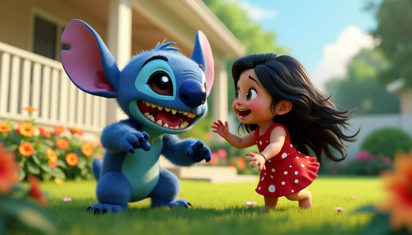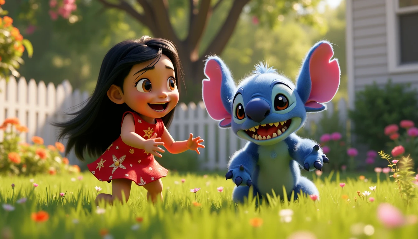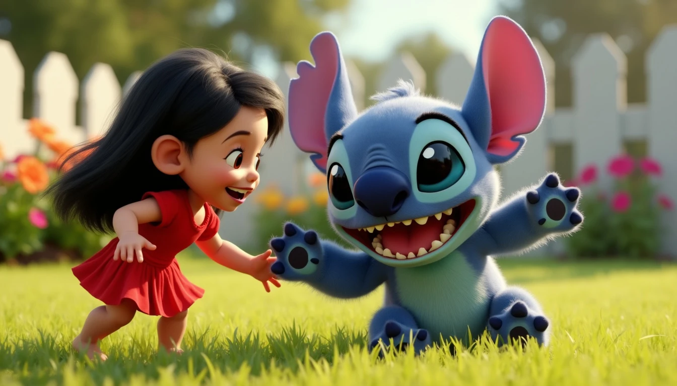 Create a hyper-realistic CGI image of Stitch as a 3D character in the real world. He should have a fluffy, detailed texture with a lifelike appearance. Stitch is joyfully playing with a real little girl resembling Lilo, who has long black hair and is wearing a red dress. The scene takes place in a sunny, suburban backyard with lush green grass, vibrant flowers, and a white picket fence. The lighting is soft and natural, highlighting the playful interaction between Stitch and Lilo, making them look like they truly exist in our world. Not animated human like