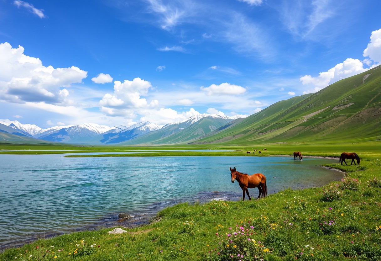 xinjiang, in the distance is the rolling snow-capped mountains, the sky is blue sky and white clouds, and nearby is a green basin. in the middle of the basin, there is water flowing from the snow-capped mountains, which flows into the lake. the lake water is clear to the bottom. there are horses grazing on the grass around the lake. there are wildflowers of various colors on the grass. very beautiful pictures, beautiful, high resolution