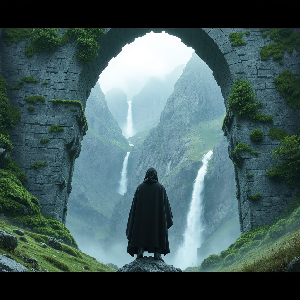 Surreal, fantasy-style image featuring a large, ancient, weatherworn stone archway covered in patches of green moss and vegetation. The archway is set against a dramatic, mountain landscape with steep cliffs and a waterfall in the background. In the foreground, a solitary figure dressed in a black cloak stands on a rock, facing away from the viewer, adding a sense of scale and contemplation to the scene. The overall color palette is muted with shades of green, gray, and white, creating a mystical and serene atmosphere.