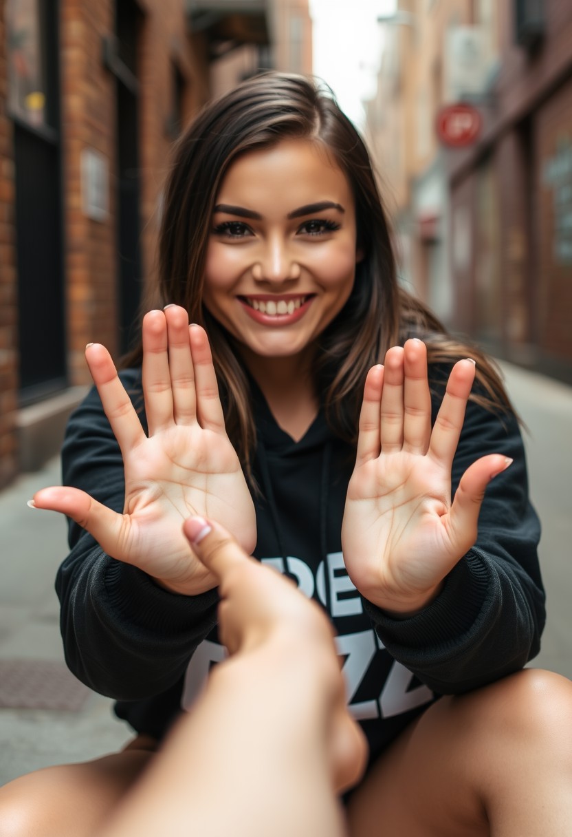Young Woman smiling with spread hands towards viewer palms up as if to recieve something on hand, sitting in the alley, wearing black hoodie with text "Need BUZZ" and yellow lightning bolt logo, blurry city background, makeup, mascara, eyeliner