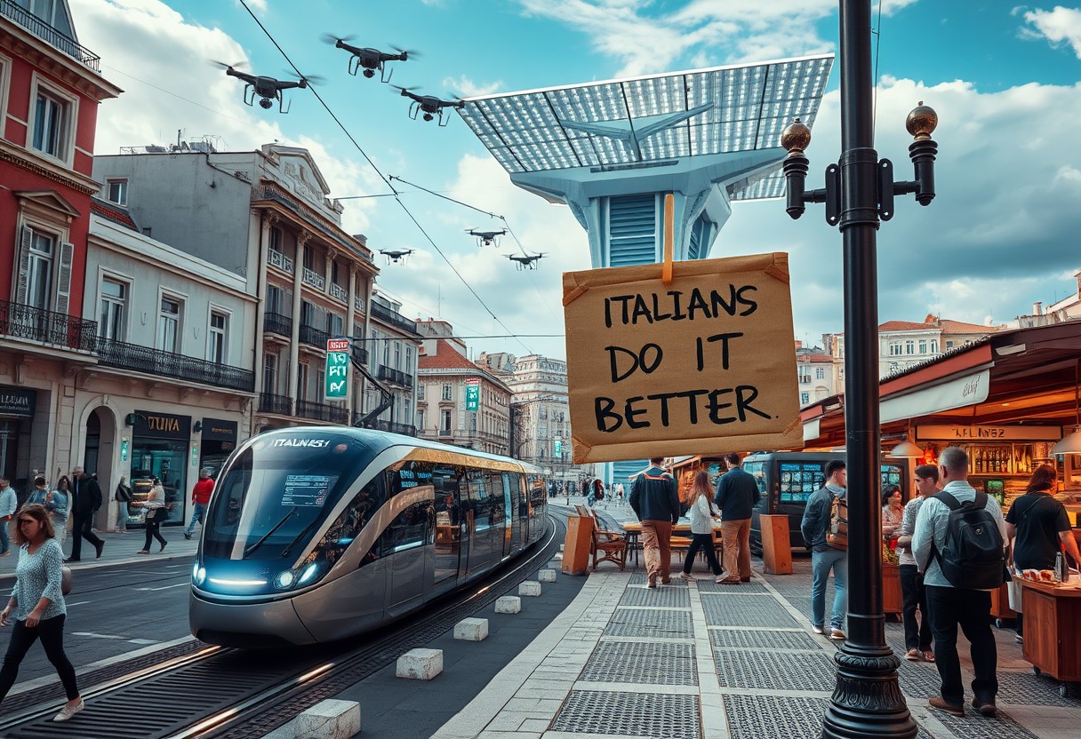 Create a highly engaging and futuristic scene set in Lisbon, Portugal, where advanced technology has seamlessly integrated into daily life. Picture the iconic Lisbon streets, with traditional tiled buildings now adorned with holographic displays and augmented reality interfaces. A sleek, autonomous tram glides silently along tracks embedded with LED lights, casting a soft glow. People wearing augmented reality glasses navigate bustling markets, where vendors use digital assistants to offer personalized recommendations. The sky above is filled with drones delivering packages, while a massive solar-powered structure looms in the background, symbolizing Portugal’s commitment to renewable energy and innovation. Amidst this high-tech setting, there’s a playful touch: a cardboard sign taped to a lamp post, handwritten in bold letters, “ITALIANS DO IT BETTER,” adding a cheeky, human element to the otherwise ultra-modern landscape.