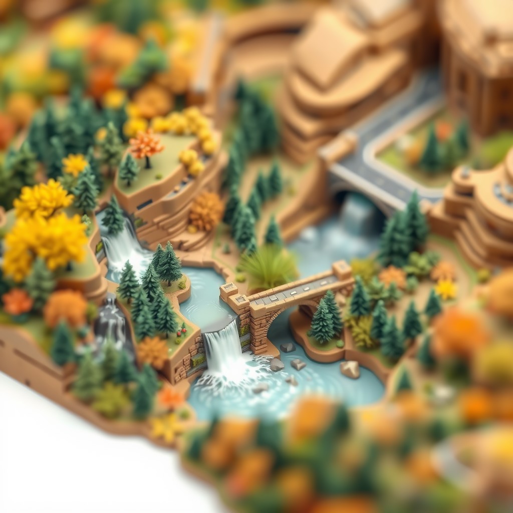 (isometric view, 3d square mini word, miniature,tilt-shift lens:1.5),(side view:1.3),3d,CG,photo,waterfall,forest,gradation,autumn,grand_canyon,brick_arch_truss_bridge,road,tunnel, isolated on a white background,