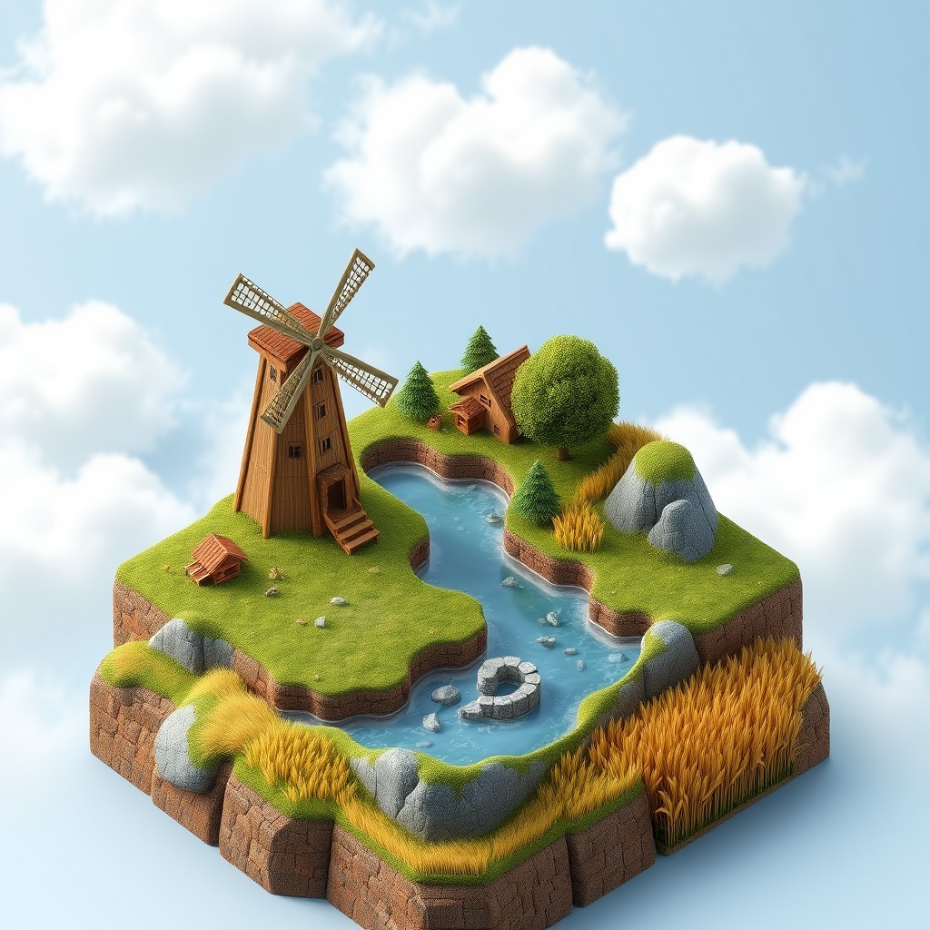 3D realistic, isometric mini world, video game map, river, watermill, wooden watch tower, wheat field, stone pathway, clouds