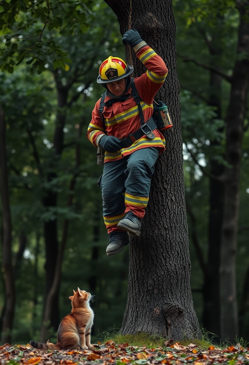 realistic photo of fireman hanging in a tree. small cat on the ground looking up at fireman stuck in tree.