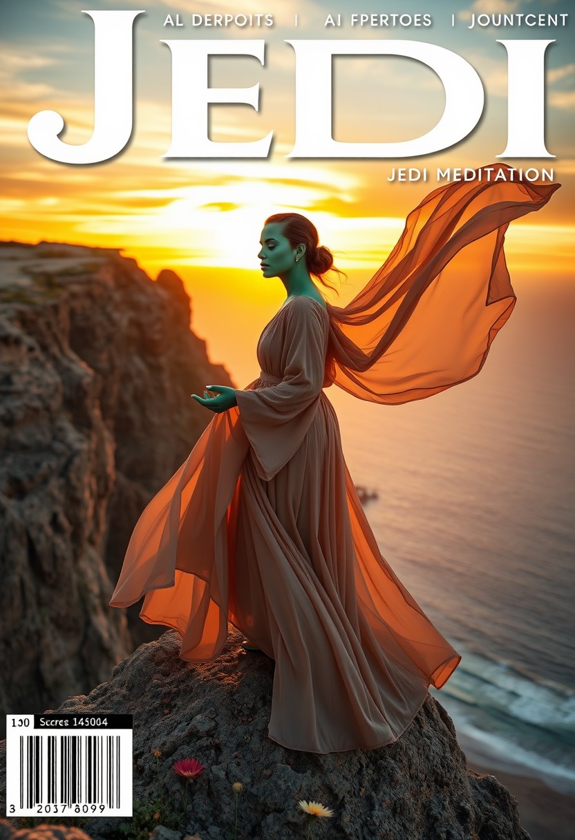 (score_9, score_8_up, score_7_up, score_6_up, Magazine cover, Title: "Jedi", Jedi in text and barcode left bottom corner,(Jedi meditation:1.0), (Beautiful green skin woman), elegant long flowing gossamer dress, dramatic wind-blown movement, perched on a rugged cliff top, vibrant sunset colors illuminating the sky, serene sea and beach below, warm golden hues, breathtaking scenery, soft romantic ambiance, vivid details, high depth cinematic masterpiece, ultra-detailed, atmospheric setting), surrounded by blooming desert flowers, harmonizing with the Force, spiritual retreat, transcendent tranquility, desert enlightenment, rich textures, ultra-detailed, (high quality) 4K resolutions, easynegative, ng_deepnegative_v1_75t, negative_hand