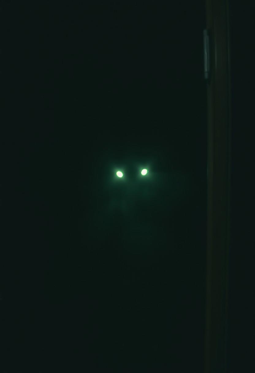 Film grain, subtle lighting, darkness, glowing eyes, blurred movement, implied lurking, foggy, cinematic, foind footage, raw, horror, incomprehensible, unsettling, enigmatic presence, terror