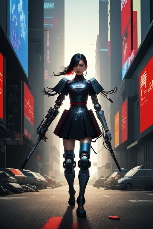 cyberpunk, anime, Cyber Punk cyborg Samurai woman standing wide stride with a red sun and city behind, highly detailed Mayhem style splattered Silhouette, background bizarre techno ghetto transmission, style minimalist, conceptual art posing Japanese, conceptual, 3d render, illustration, cinematic, photo epic action, cinematic, award winning artwork, many details, patterned illumination, bad VHS tape image artifacts