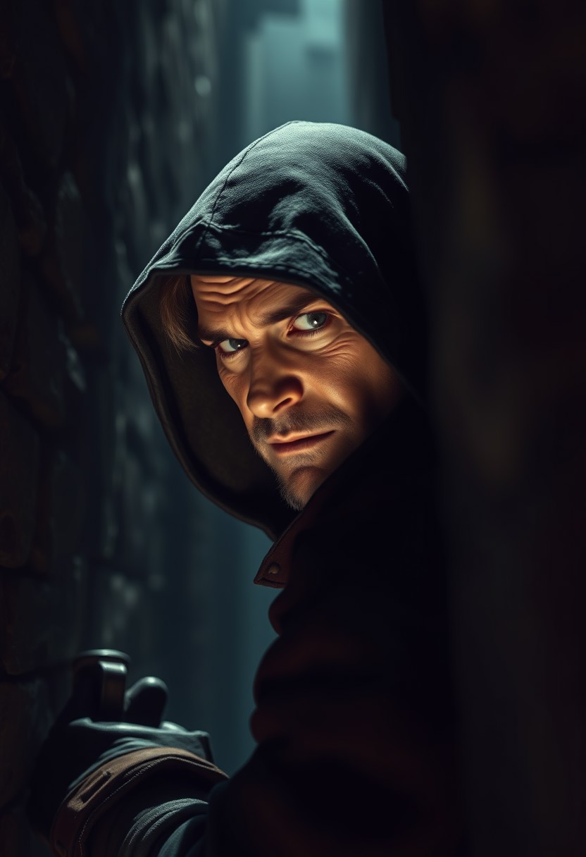 movie still, film photography, cinematic, Smug medieval thief hiding in shadowy alley, dynamic action pose, dnd character, dynamic character profile, half-body portrait, closeup, intricately detailed perfect face, fantasy, photorealistic, photorealism, perfect image, haze, soft light from side, 3 point lighting, backlight, chiaroscuro, perspective, depth, trending on artstation