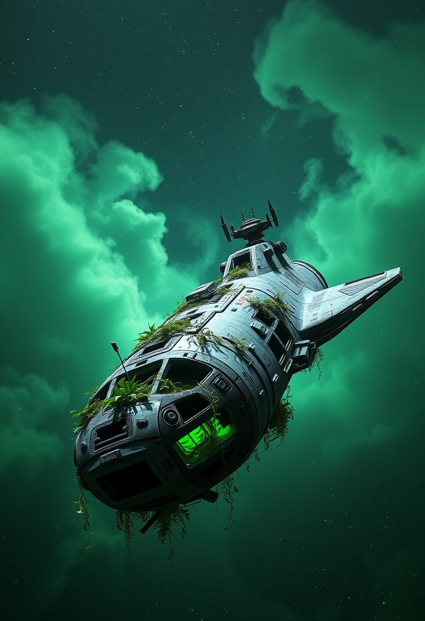 sci-fi movie still, photograph, derelict space ship floating at odd angle in space overrun with green plants coming out broken windows, green gaseous nebula background, space photography, interesting camera angel, photorealistic, breathtaking, beautiful, awe-inspiring, trending on artstation