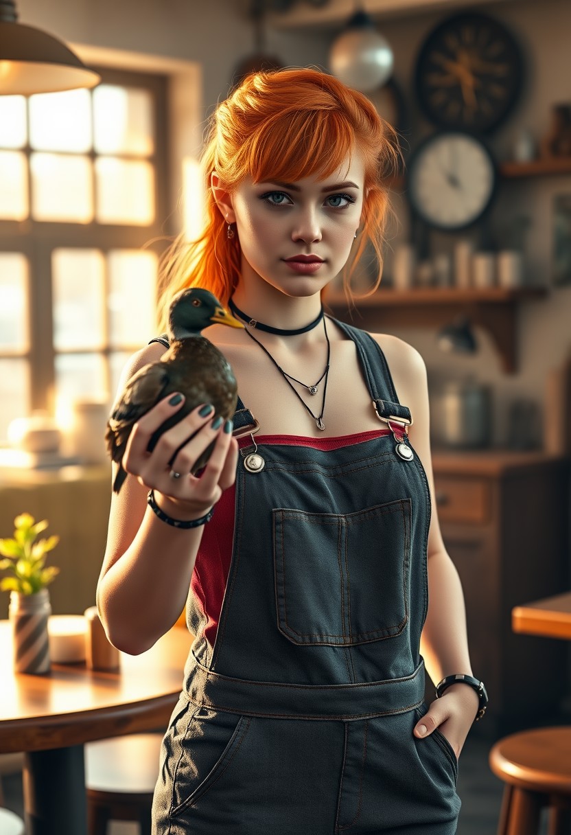 Photorealistic photography of Cafe environment, with a young 18 years old alchemist featuring ginger hair, sw33ny, grey eyes, beautiful figure in a stylish overalls, wearing satanic accessories, necklace, punk style ear piercing, standing, Balancing a duck on her fingertips, looking confident. Soft ambient lighting, enhancing the warm workshop atmosphere. Warm, natural light streaming in through the windows. 8K resolution for ultra-high detail. Hyperrealistic textures for maximum realism. Photorealistic rendering for a lifelike appearance. Ultra-sharp focus on key elements. Cinematic color grading for a filmic look. Dynamic range to capture the full spectrum of light. High dynamic range (HDR) for balanced lighting. Soft focus on background elements to create depth. Fine detail enhancement for intricate textures. Ultra-high contrast for dramatic effect. Realistic depth of field for a natural look. Vivid color saturation for a vibrant scene. Sharp edge detailing on the character and cafe furniture. Smooth gradient transitions for a polished look. Subtle vignetting to focus attention on the character. Enhanced clarity on all elements. Realistic motion blur for any movement. Perfectly balanced lighting for a natural feel. Natural color tones for the cafe and character. Crisp shadow definition for high detail. Warm, inviting color palette for a serene atmosphere.