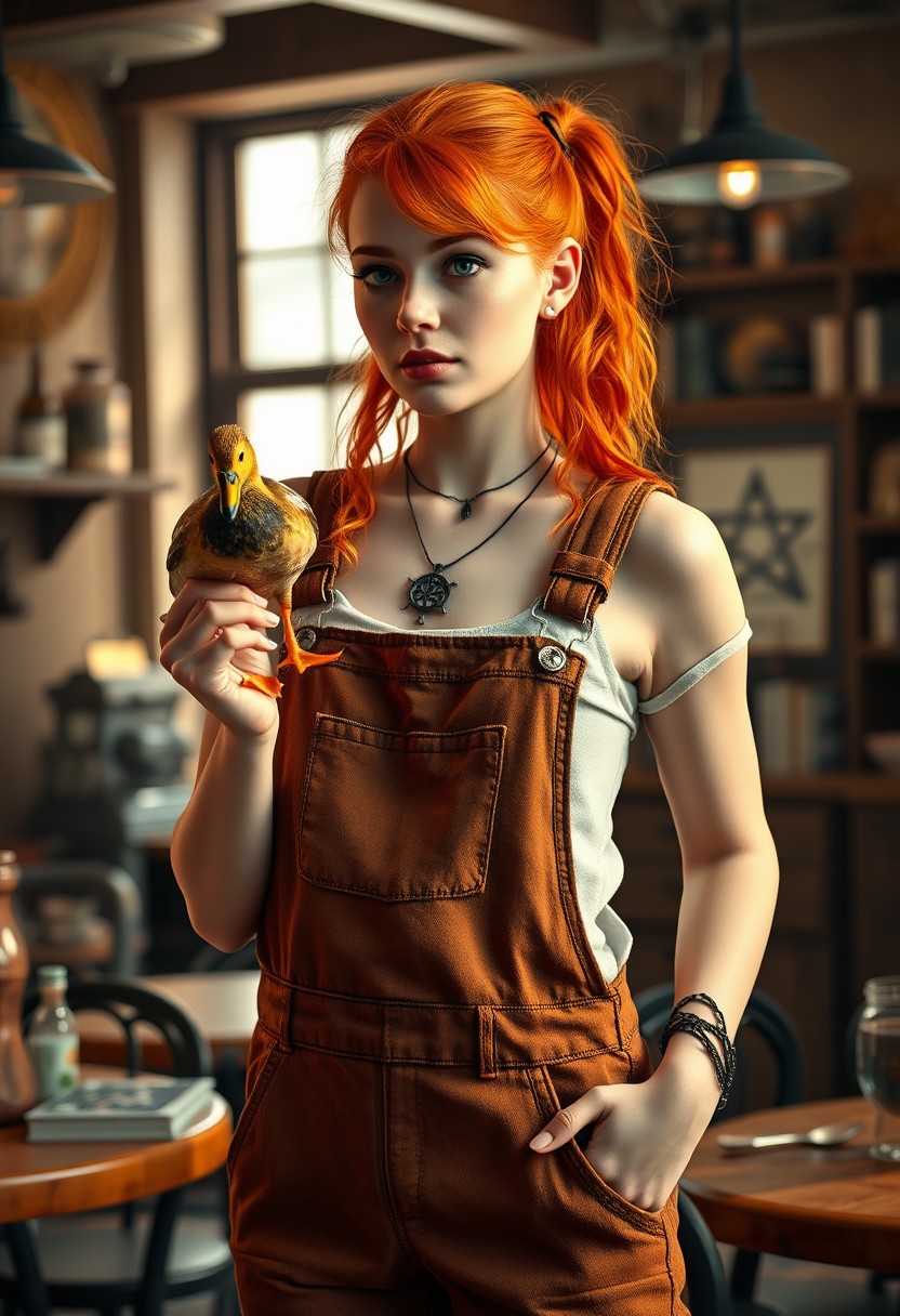 Photorealistic photography of Cafe environment, with a young 18 years old alchemist featuring ginger hair, sw33ny, grey eyes, beautiful figure in a stylish overalls, wearing satanic accessories, necklace, punk style ear piercing, standing, Balancing a duck on her fingertips, looking confident. Soft ambient lighting, enhancing the warm workshop atmosphere. Warm, natural light streaming in through the windows. 8K resolution for ultra-high detail. Hyperrealistic textures for maximum realism. Photorealistic rendering for a lifelike appearance. Ultra-sharp focus on key elements. Cinematic color grading for a filmic look. Dynamic range to capture the full spectrum of light. High dynamic range (HDR) for balanced lighting. Soft focus on background elements to create depth. Fine detail enhancement for intricate textures. Ultra-high contrast for dramatic effect. Realistic depth of field for a natural look. Vivid color saturation for a vibrant scene. Sharp edge detailing on the character and cafe furniture. Smooth gradient transitions for a polished look. Subtle vignetting to focus attention on the character. Enhanced clarity on all elements. Realistic motion blur for any movement. Perfectly balanced lighting for a natural feel. Natural color tones for the cafe and character. Crisp shadow definition for high detail. Warm, inviting color palette for a serene atmosphere.