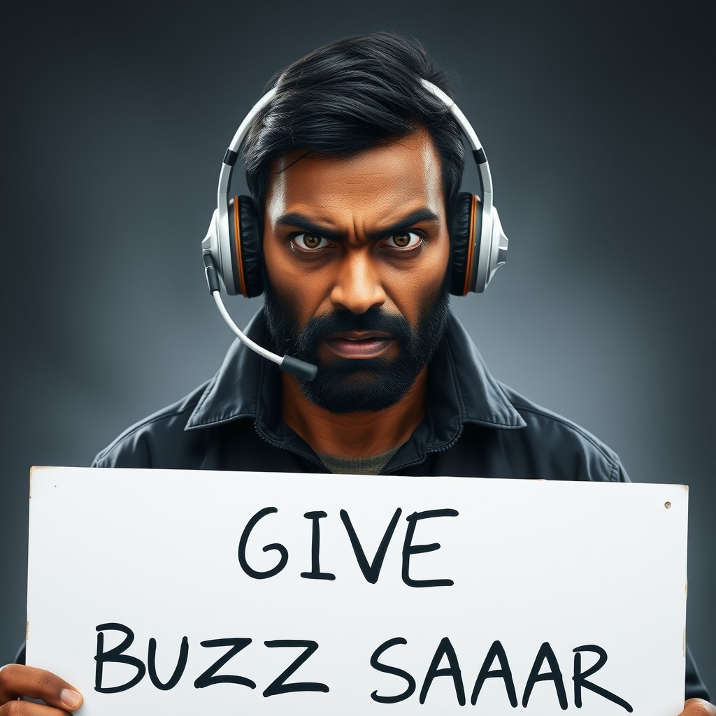 indian tech support guy, with creepy looking eyes holding a sign that says "GIVE BUZZ SAAAR", looking angry