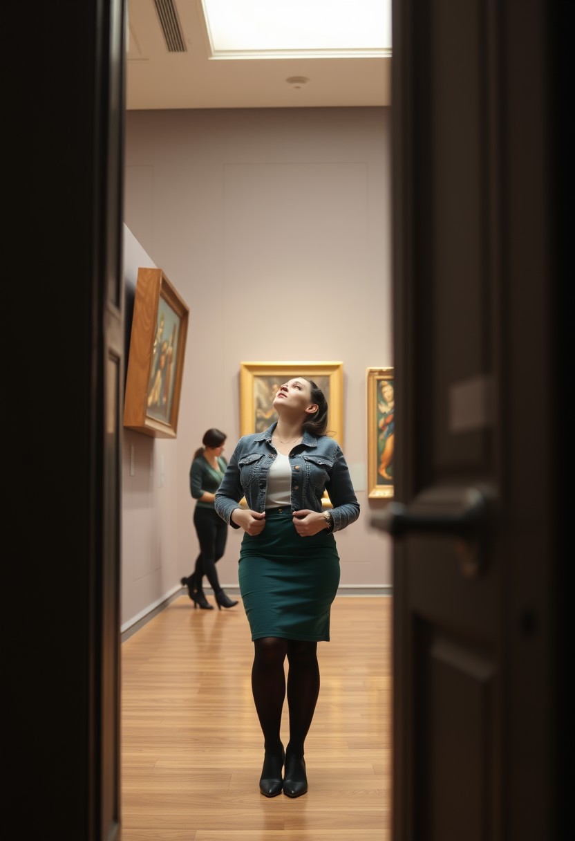 a candid photograph zoomed in through a doorway of a thick curvy and fit hourglass figure caucasian woman with pale white skin and freckles gazing up at an artwork in a modern museum, wearing a teal pencil skirt, tights and a cropped denim jacket