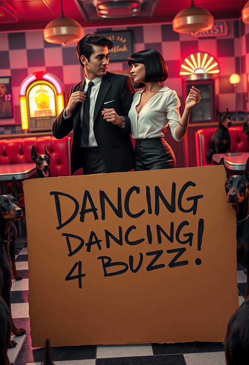 Create a highly realistic image of a dance scene inspired by “Pulp Fiction,” with a distinctive twist. The setting is a 1950s diner with black-and-white checkered floors, red vinyl booths, and neon lights casting a warm, nostalgic glow. A vintage jukebox adds colorful light in the background. In the foreground, two characters are mid-dance: a man with slicked-back dark hair in a sharp black suit, white shirt, and skinny tie, and a woman with a sleek black bob haircut, wearing a white blouse and black pants. They strike a lively, playful pose. Prominently in front of them is a large cardboard sign, almost stealing the spotlight. The sign reads “DANCING 4 BUZZ!” in bold, hand-drawn letters, with a worn, DIY appearance. The cardboard, slightly creased and smudged, adds a quirky, humorous element to the scene. Surrounding the dance floor are several dobermans with sharp, realistic features and glowing red eyes, their tense postures creating an eerie, surreal contrast to the vibrant dance. The prominent cardboard sign in the foreground blends humor with the intense, otherworldly atmosphere, making the overall image vividly real yet unsettling.