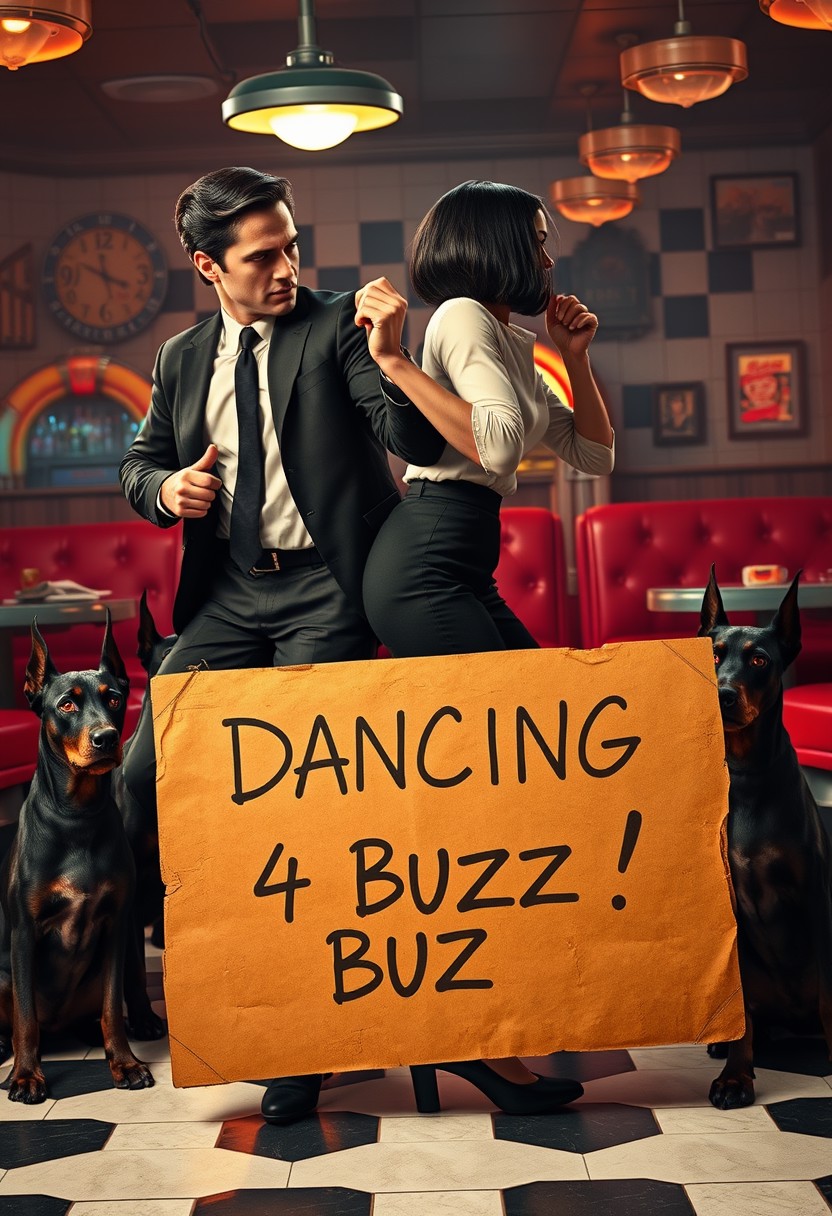 Create a highly realistic image of a dance scene inspired by “Pulp Fiction,” with a distinctive twist. The setting is a 1950s diner with black-and-white checkered floors, red vinyl booths, and neon lights casting a warm, nostalgic glow. A vintage jukebox adds colorful light in the background. In the foreground, two characters are mid-dance: a man with slicked-back dark hair in a sharp black suit, white shirt, and skinny tie, and a woman with a sleek black bob haircut, wearing a white blouse and black pants. They strike a lively, playful pose. Prominently in front of them is a large cardboard sign, almost stealing the spotlight. The sign reads “DANCING 4 BUZZ!” in bold, hand-drawn letters, with a worn, DIY appearance. The cardboard, slightly creased and smudged, adds a quirky, humorous element to the scene. Surrounding the dance floor are several dobermans with sharp, realistic features and glowing red eyes, their tense postures creating an eerie, surreal contrast to the vibrant dance. The prominent cardboard sign in the foreground blends humor with the intense, otherworldly atmosphere, making the overall image vividly real yet unsettling.