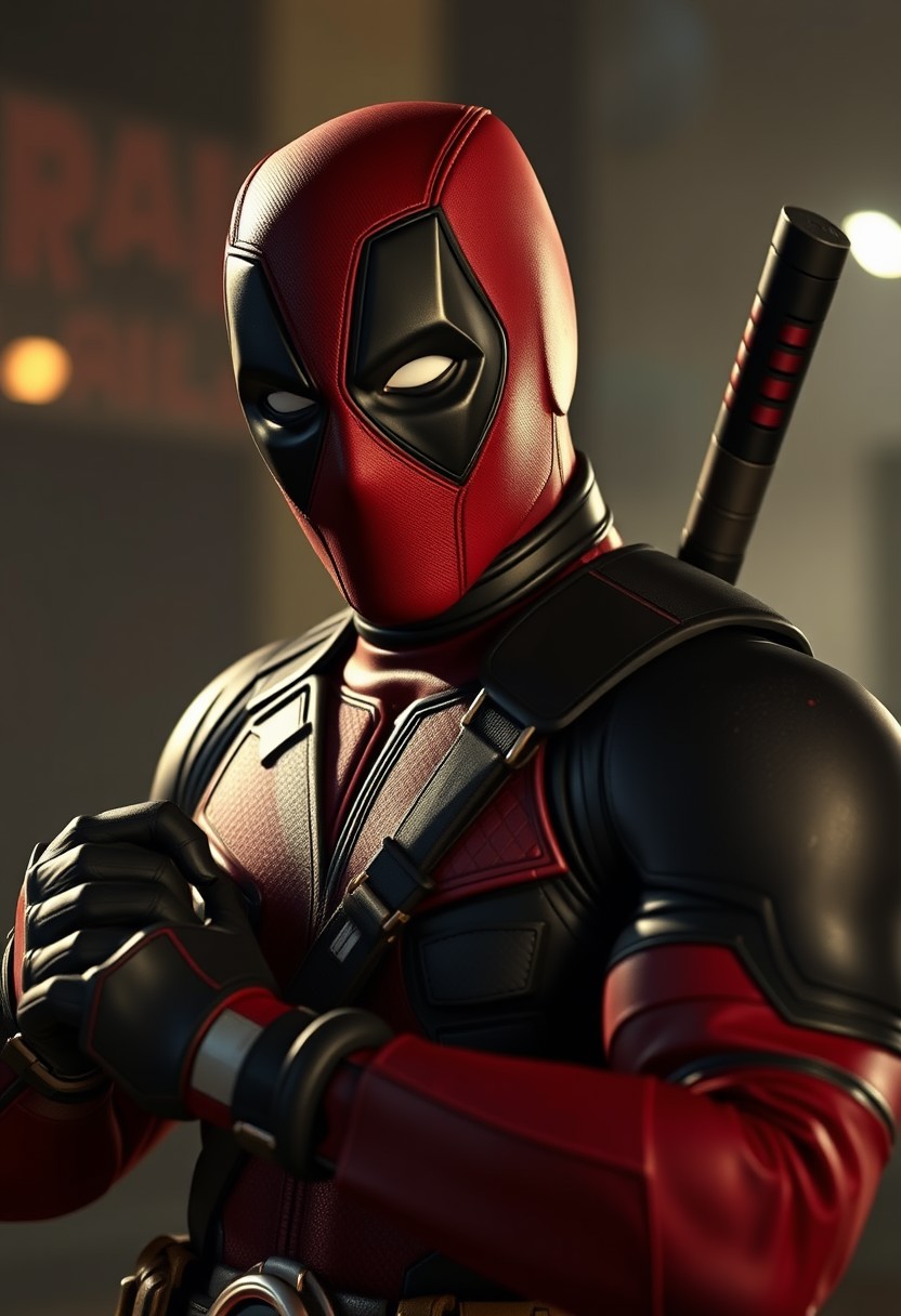 Deadpool getting ready for battle, highres, best quality, realistic, cinematic lighting, hyperrealistic, perfect quality