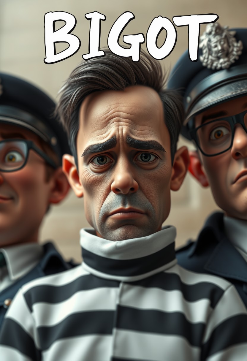 Pixar inspired poster, A perfect masterpiece pixar style movie poster of a pixar disney movie called "BIGOT", the word (BIGOT) is written at the top of poster in black and white sketchy font, the poster shows a close up of three a highly detailed CGI pixar charactes, in the middle a sad man in prisoner clothes, on his left and right two Pixar style British Police men, life-like masterpiece realitic photo, hyper realistic, A photogenic soft scene, digital 4k art, bokeh, depth of field, detailed eyes, 4K, vivid, extremely detailed, perfect anatomy, maximalist, dynamic, absurdres, 8k photography, three point perspective, Ultra-realistic, Hyperrealism