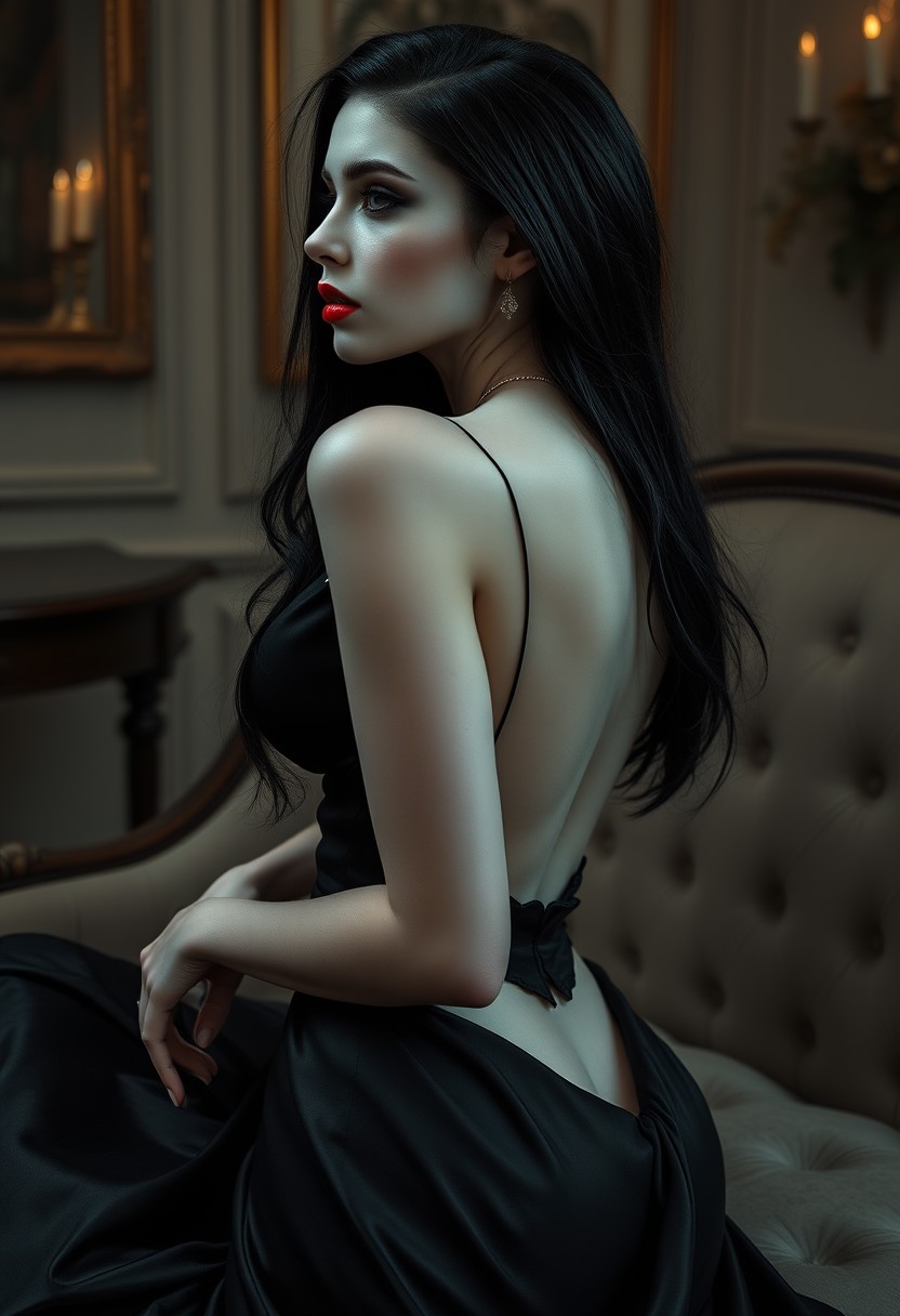 Masterpiece, Portrait of a sexy gothic debutante, highly detailed, best quality, beautiful face profile, full red lips, closed mouth, HairDetail, long flowing black arched back, very pale white skin, ghostly pale, romantic parlor, black silk evening gown, huge breasts, sideboob, slender body, tiny waist, defined abs, curvy hips, round ass, simple jewelry, laying seductively on an upholstered chaise lounge, sensual dim lighting, hidden hands, eye contact, lustful gray eyes