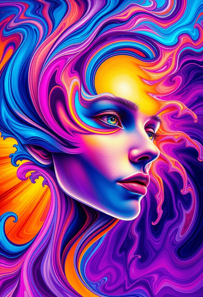 A vibrant, surreal depiction of a human face made entirely of swirling, abstract shapes and colors. The face emerges from a cascade of fluid, flowing patterns in a mesmerizing blend of electric blues, fiery oranges, vivid pinks, and deep purples. Each curve and swirl seamlessly transitions into the next, creating a dynamic and fluid motion that makes the face appear as if it is both forming and dissolving into the colorful background. The composition is highly detailed, with intricate, ribbon-like textures that twist and turn, adding depth and complexity to the image. The eyes, nose, and lips are subtly defined, blending into the vibrant, flowing patterns around them. The background is a kaleidoscope of intense, contrasting colors, with bright yellow and orange light radiating from one side, while cooler blues and purples dominate the other, creating a striking balance. The overall effect is a mesmerizing, dreamlike representation of the human form, blending abstract art with a vivid, cosmic color palette, evoking a sense of energy and motion that draws the viewer into the swirling, colorful world.