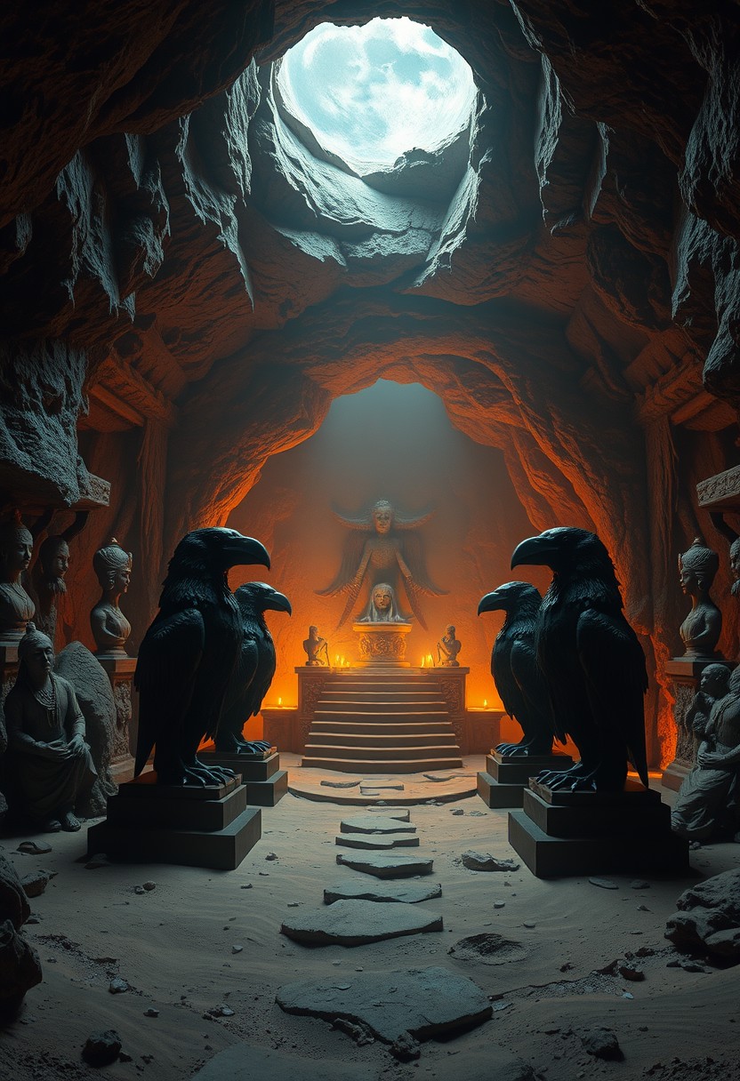 A strange occult temple with anthro crow birdman statues in a subterranean cavern hidden beneath the desert., Volumetric light, atmospheric, cinematic, realistic, magical, mythical