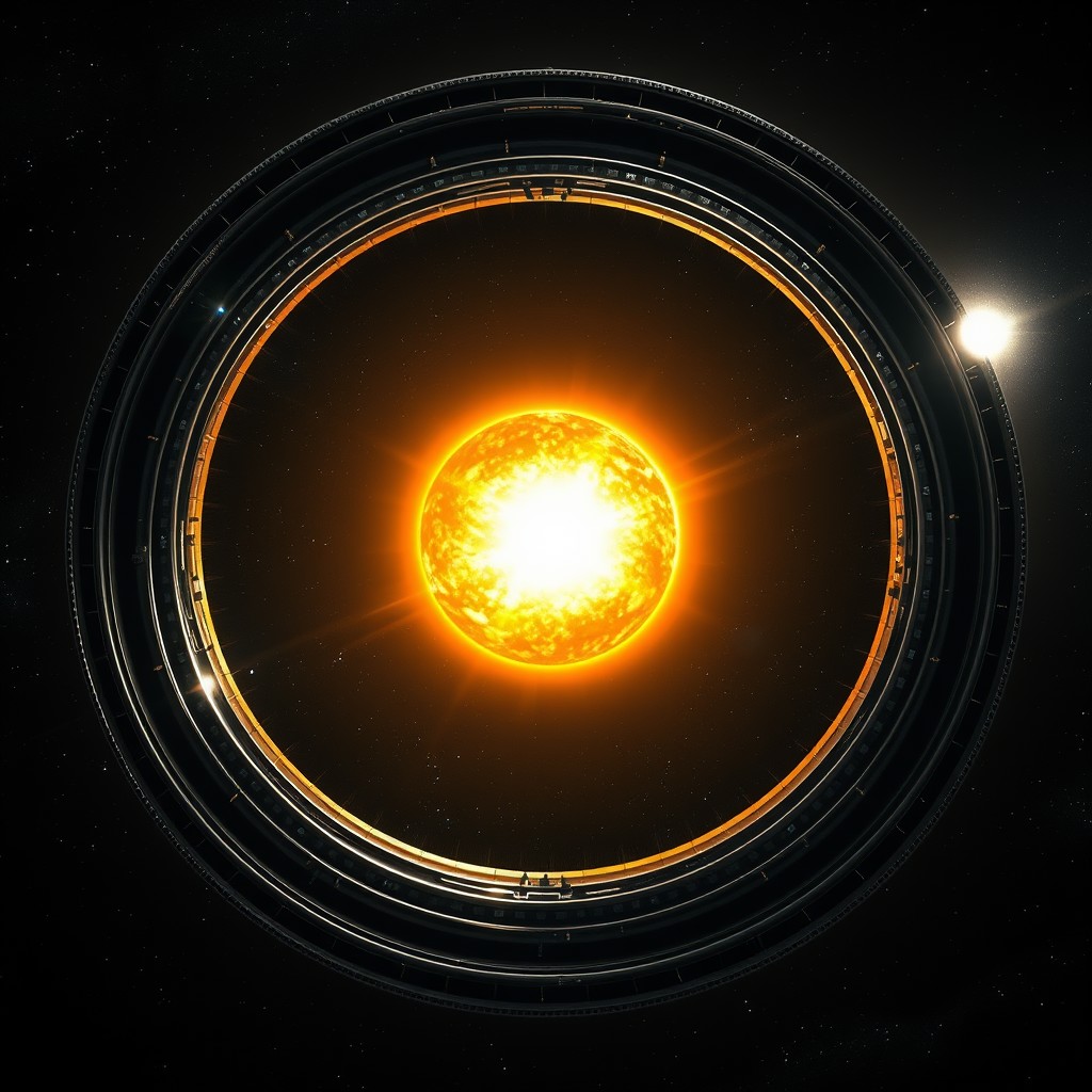 view of a atronomically sized metal ring around a sun. the inside of the ring is habitable. ringworld